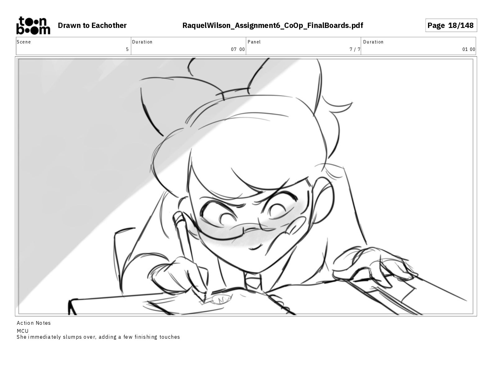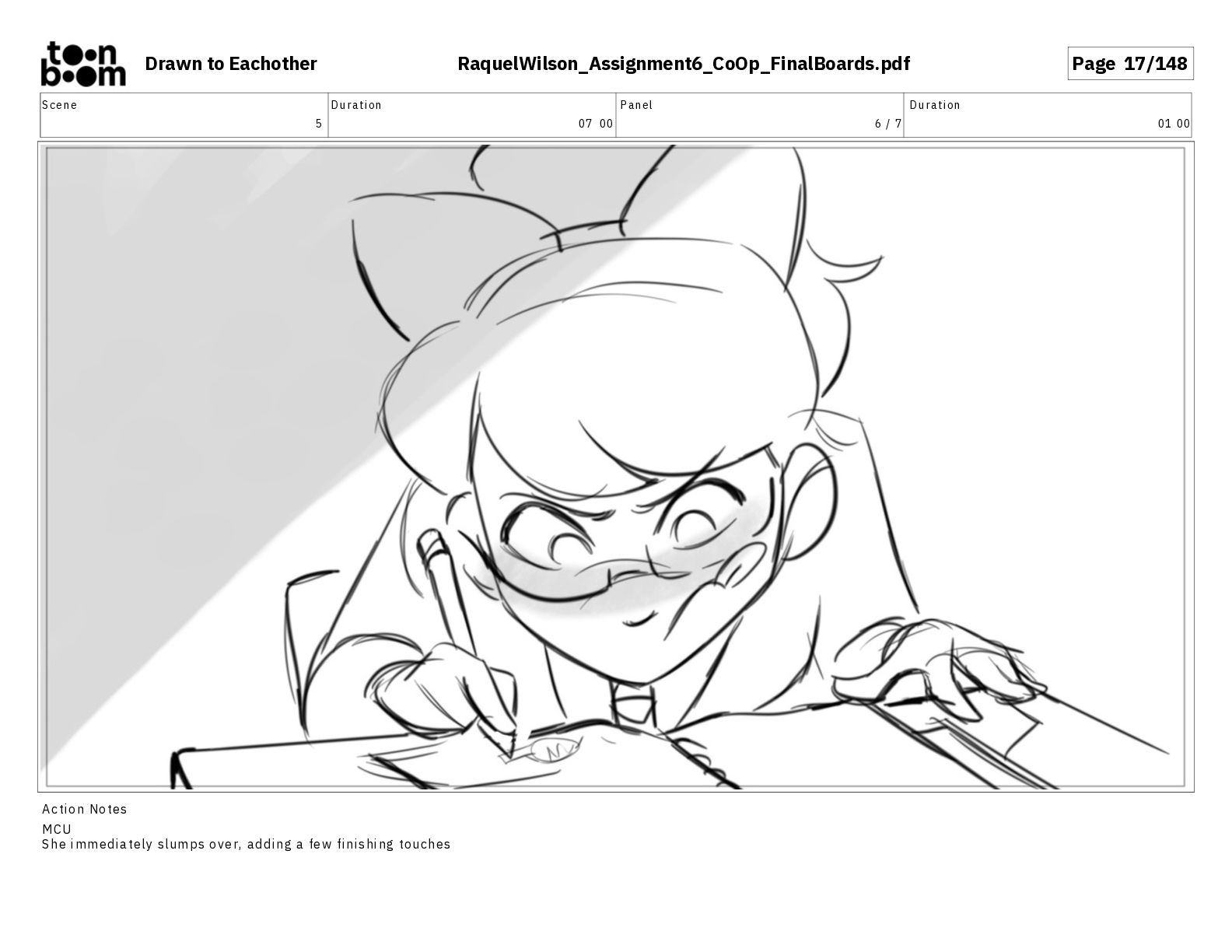 01 00 Action Notes MCU She immediately slumps over, adding a few finishing touches Drawn to Eachother RaquelWilson_Assignment6_CoOp_FinalBoards.pdf Page 17/148