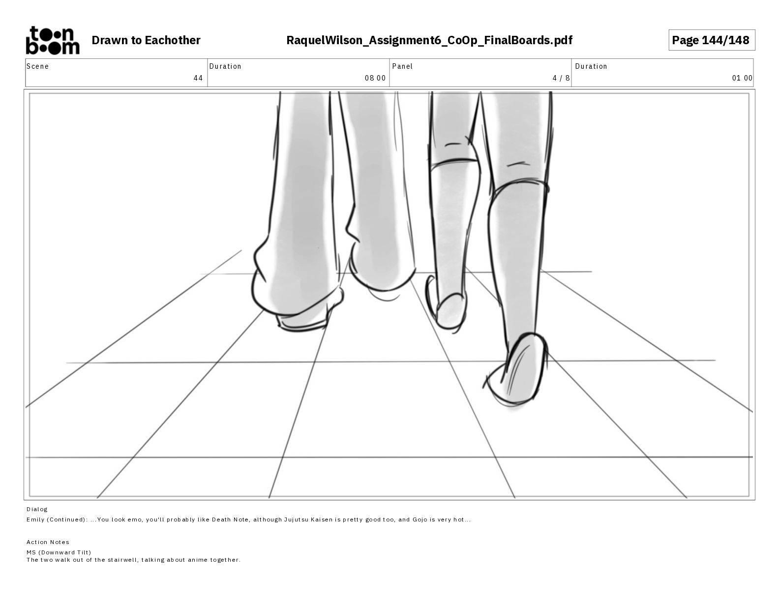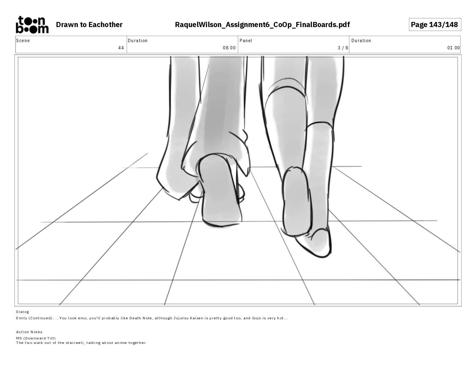 01 00 Action Notes MS (Downward Tilt) The two walk out of the stairwell, talking about anime together. Dialog Emily (Continued): ...You look emo, you'll probably like Death Note, although Jujutsu Kaisen is pretty good too, and Gojo is very hot... Drawn to Eachother RaquelWilson_Assignment6_CoOp_FinalBoards.pdf Page 144/148