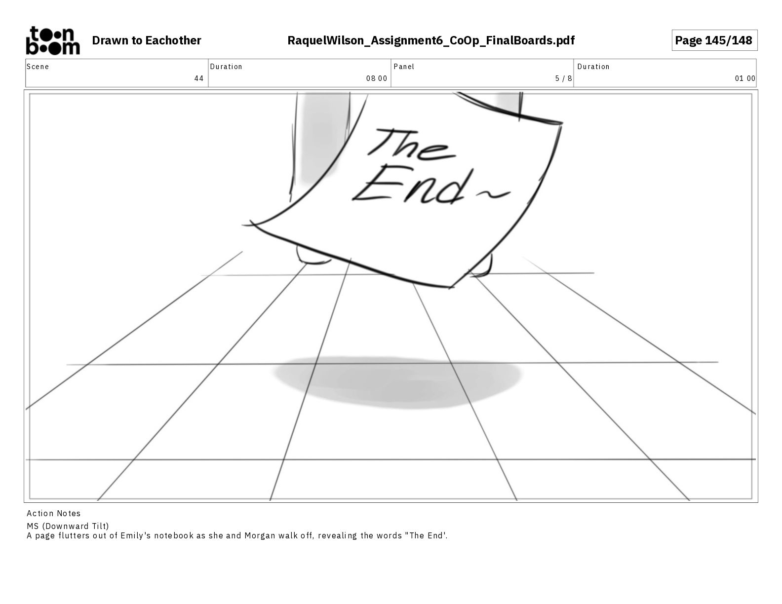 01 00 Action Notes MS (Downward Tilt) A page flutters out of Emily's notebook as she and Morgan walk off, revealing the words "The End'. Drawn to Eachother RaquelWilson_Assignment6_CoOp_FinalBoards.pdf Page 145/148
