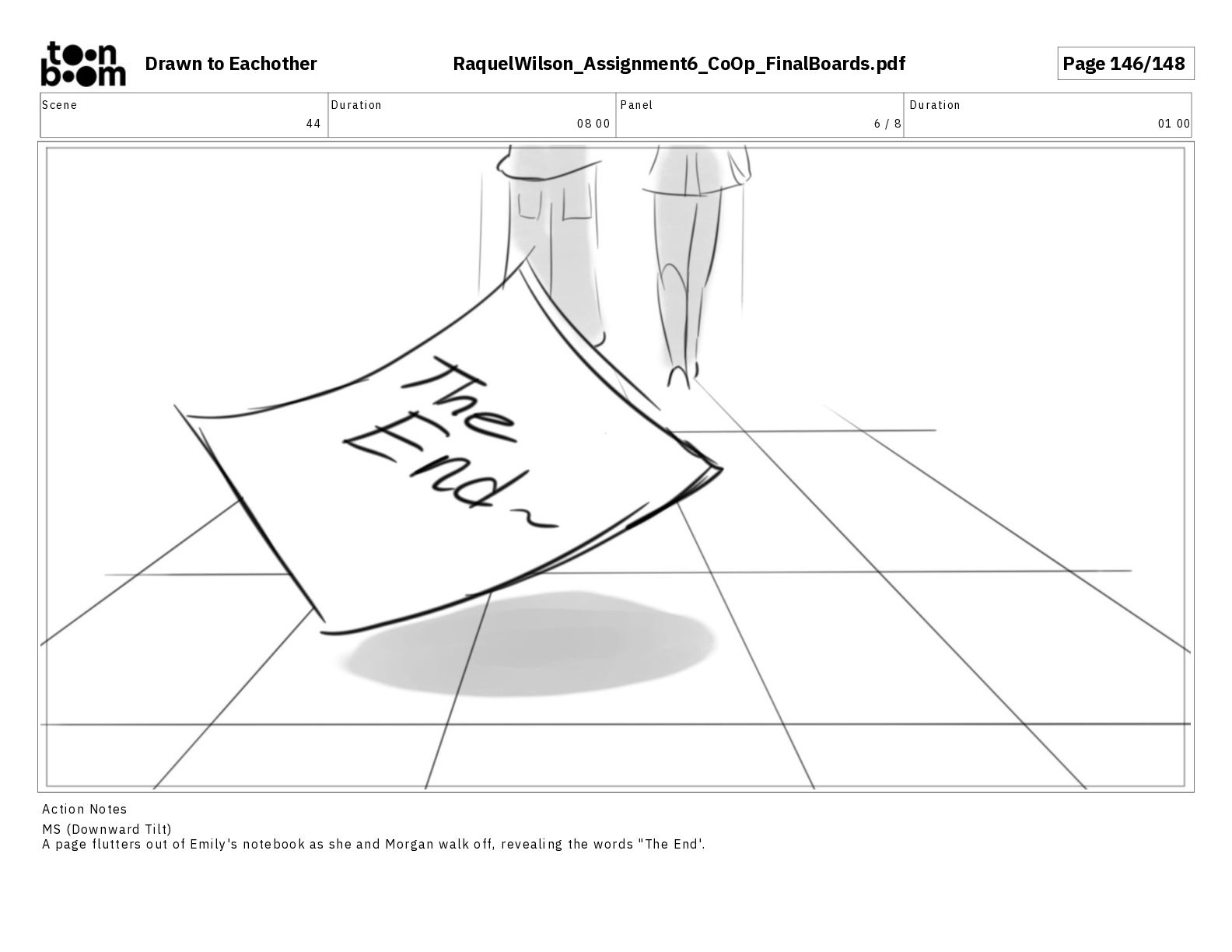 01 00 Action Notes MS (Downward Tilt) A page flutters out of Emily's notebook as she and Morgan walk off, revealing the words "The End'. Drawn to Eachother RaquelWilson_Assignment6_CoOp_FinalBoards.pdf Page 146/148