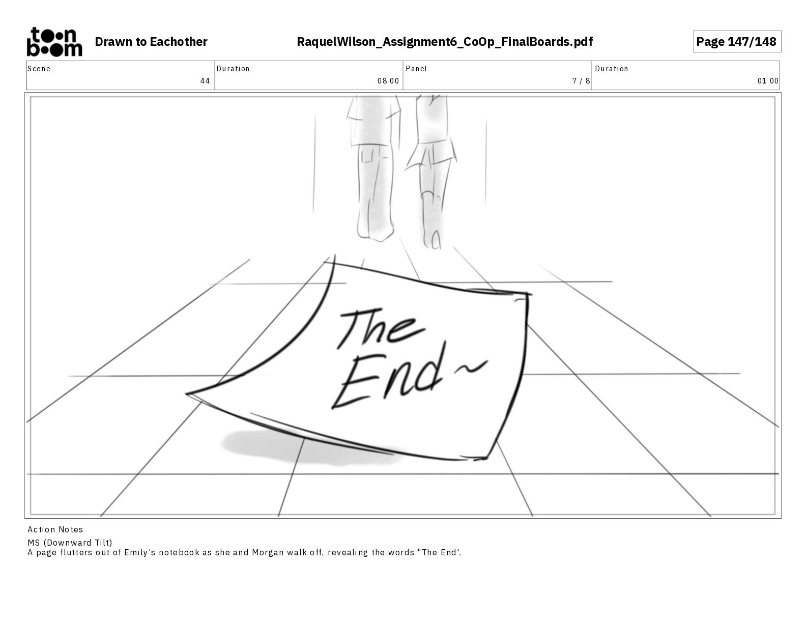 01 00 Action Notes MS (Downward Tilt) A page flutters out of Emily's notebook as she and Morgan walk off, revealing the words "The End'. Drawn to Eachother RaquelWilson_Assignment6_CoOp_FinalBoards.pdf Page 147/148