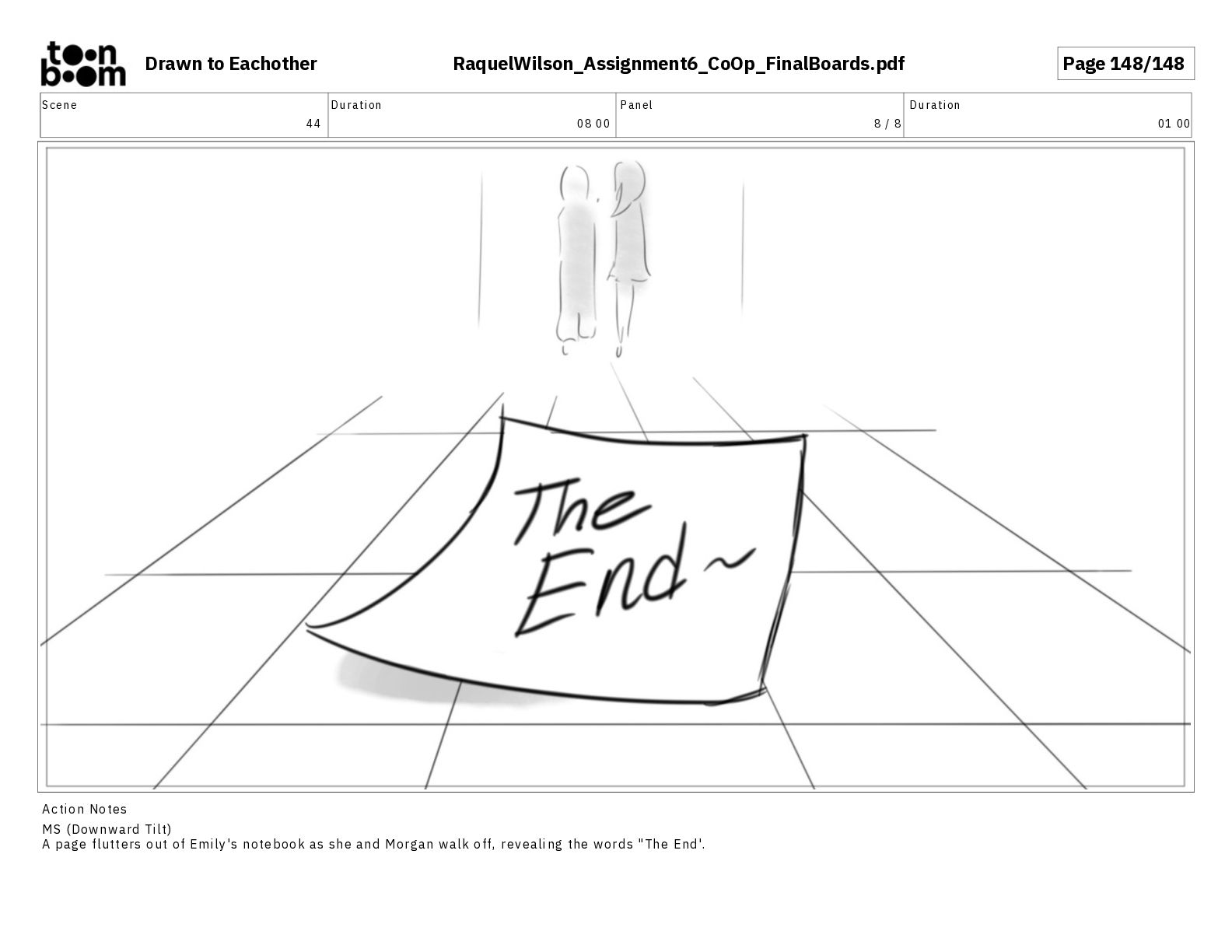 01 00 Action Notes MS (Downward Tilt) A page flutters out of Emily's notebook as she and Morgan walk off, revealing the words "The End'. Drawn to Eachother RaquelWilson_Assignment6_CoOp_FinalBoards.pdf Page 148/148