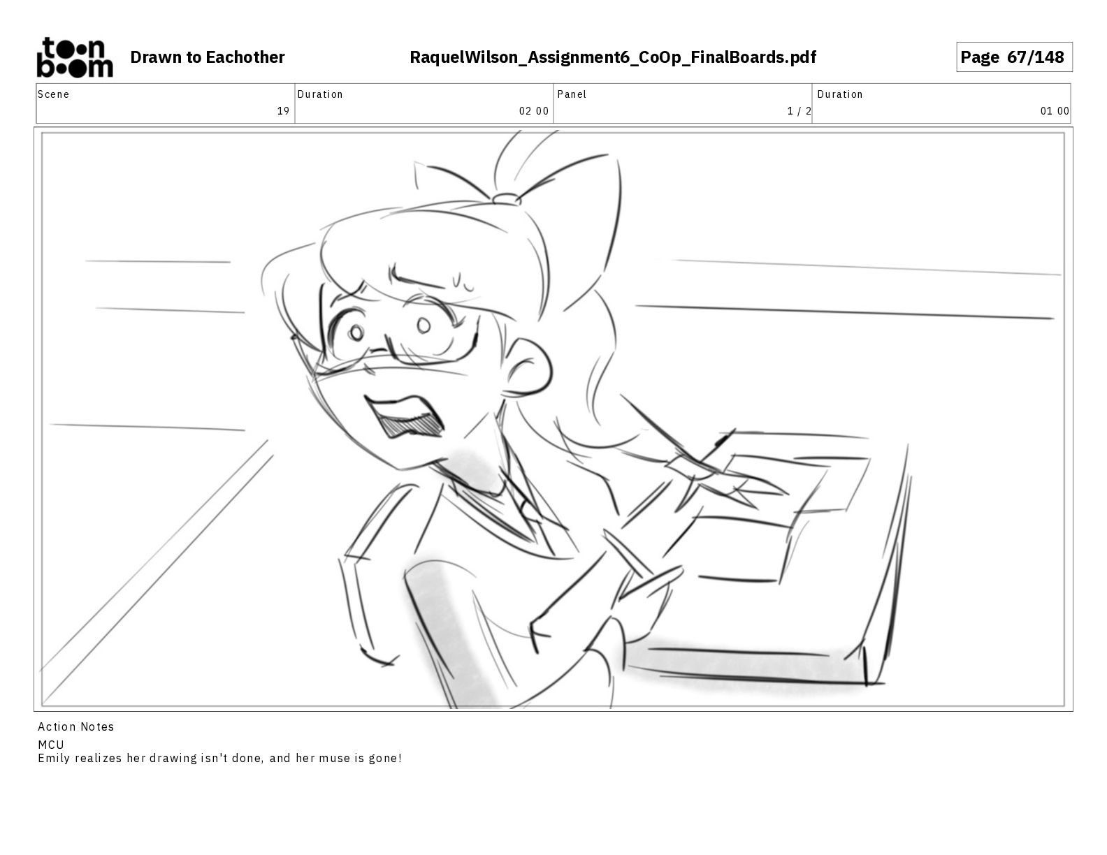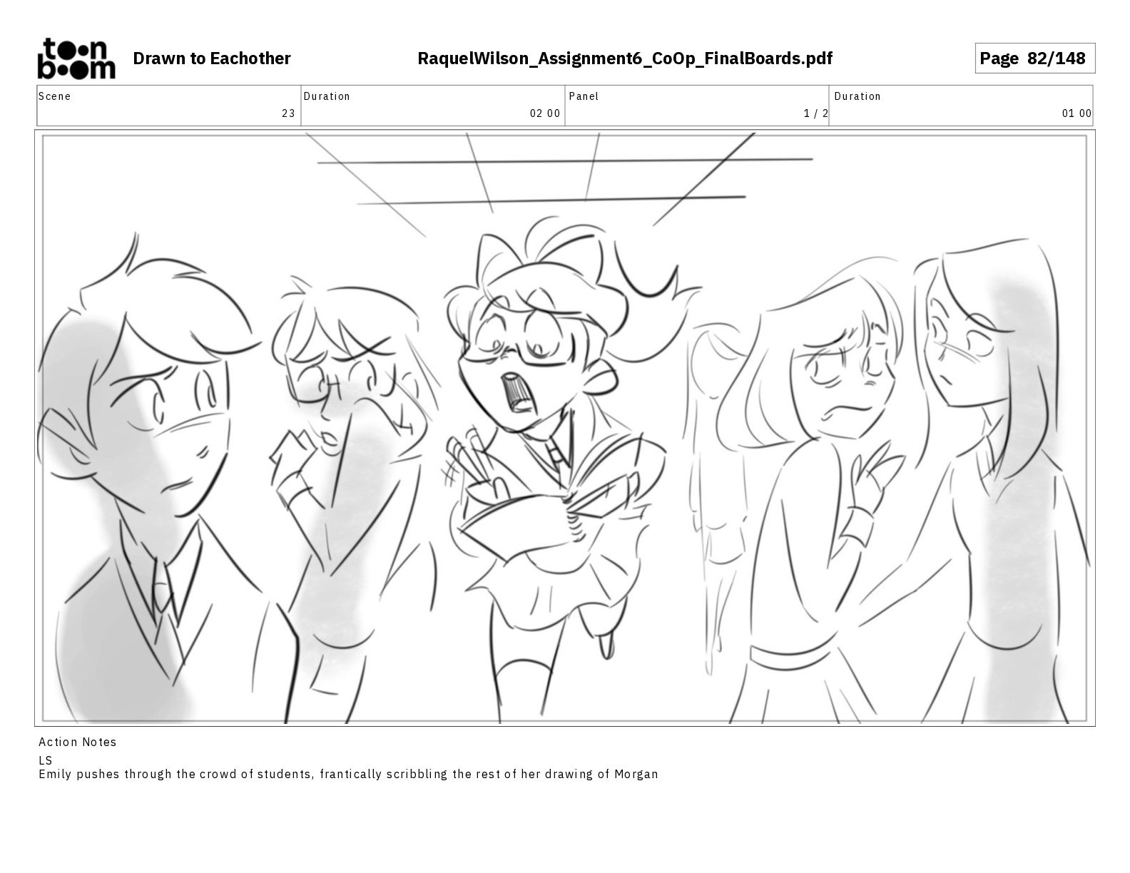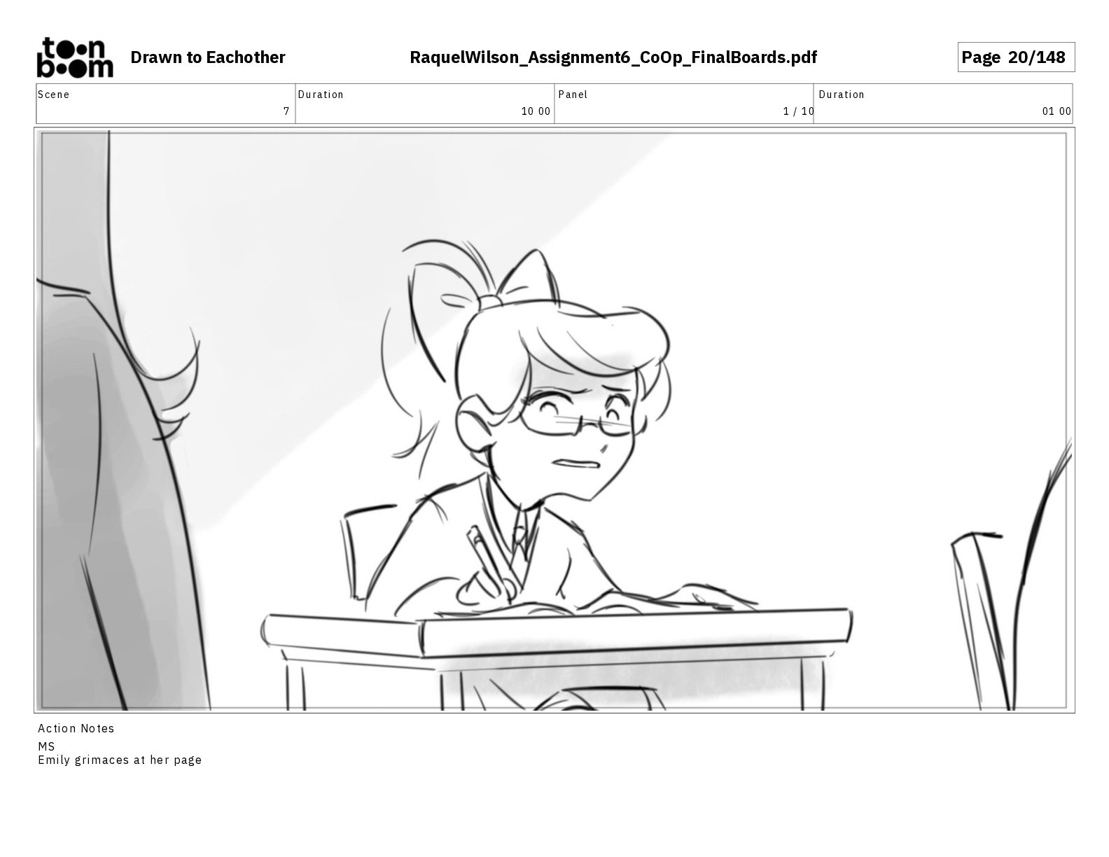 01 00 Action Notes MS Emily grimaces at her page Drawn to Eachother RaquelWilson_Assignment6_CoOp_FinalBoards.pdf Page 20/148