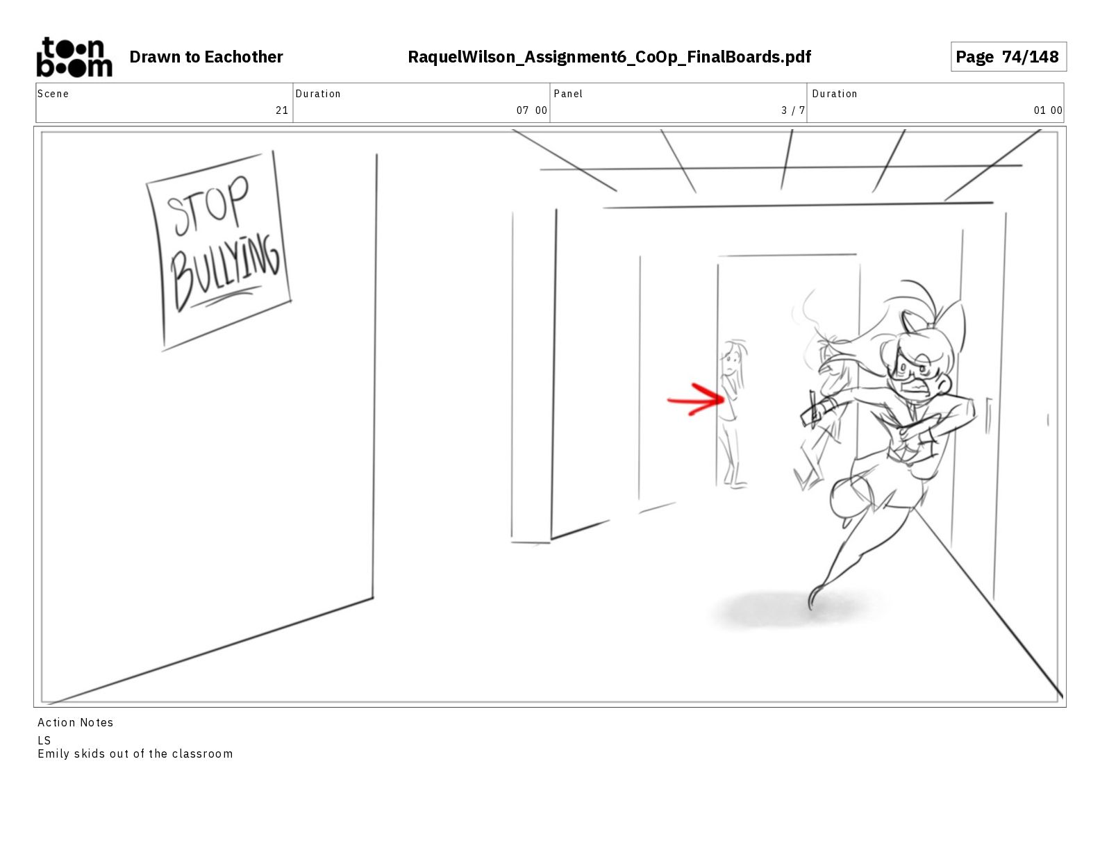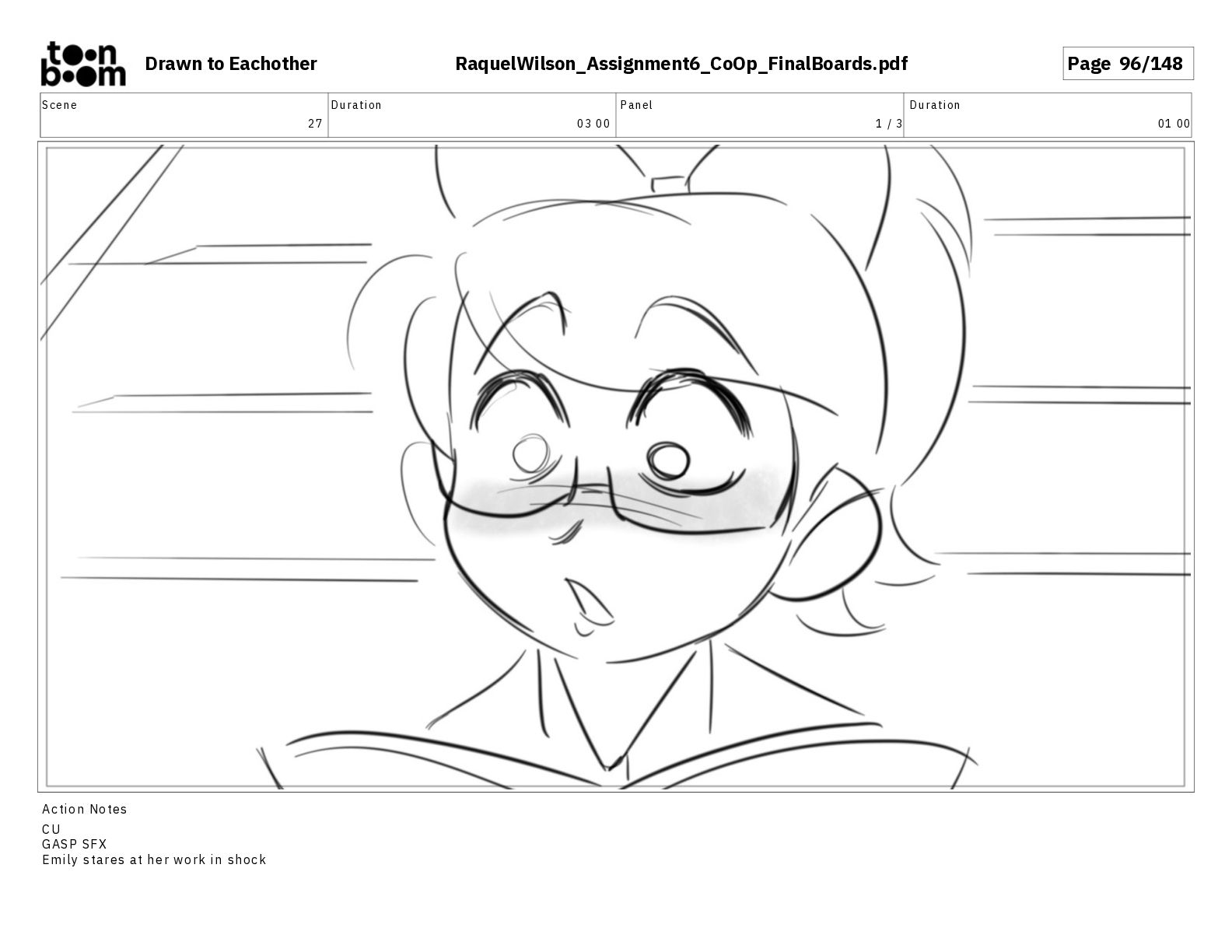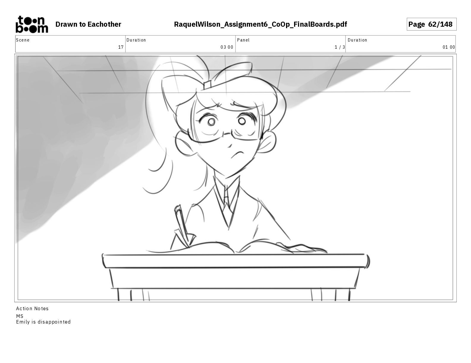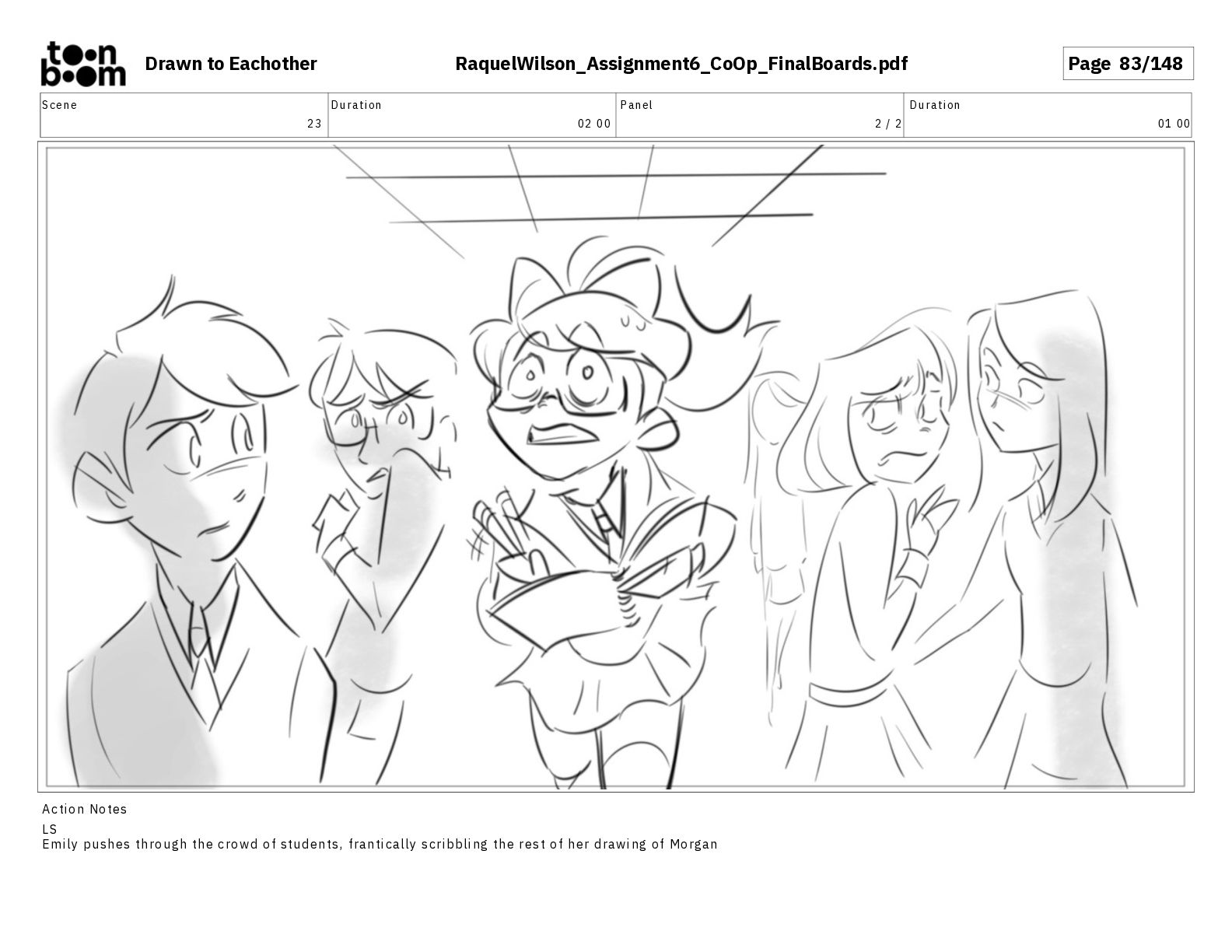 01 00 Action Notes MS Emily grimaces at her page Drawn to Eachother RaquelWilson_Assignment6_CoOp_FinalBoards.pdf Page 20/148