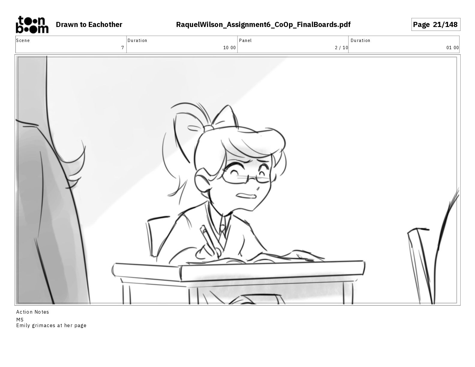 01 00 Action Notes MS Emily grimaces at her page Drawn to Eachother RaquelWilson_Assignment6_CoOp_FinalBoards.pdf Page 21/148