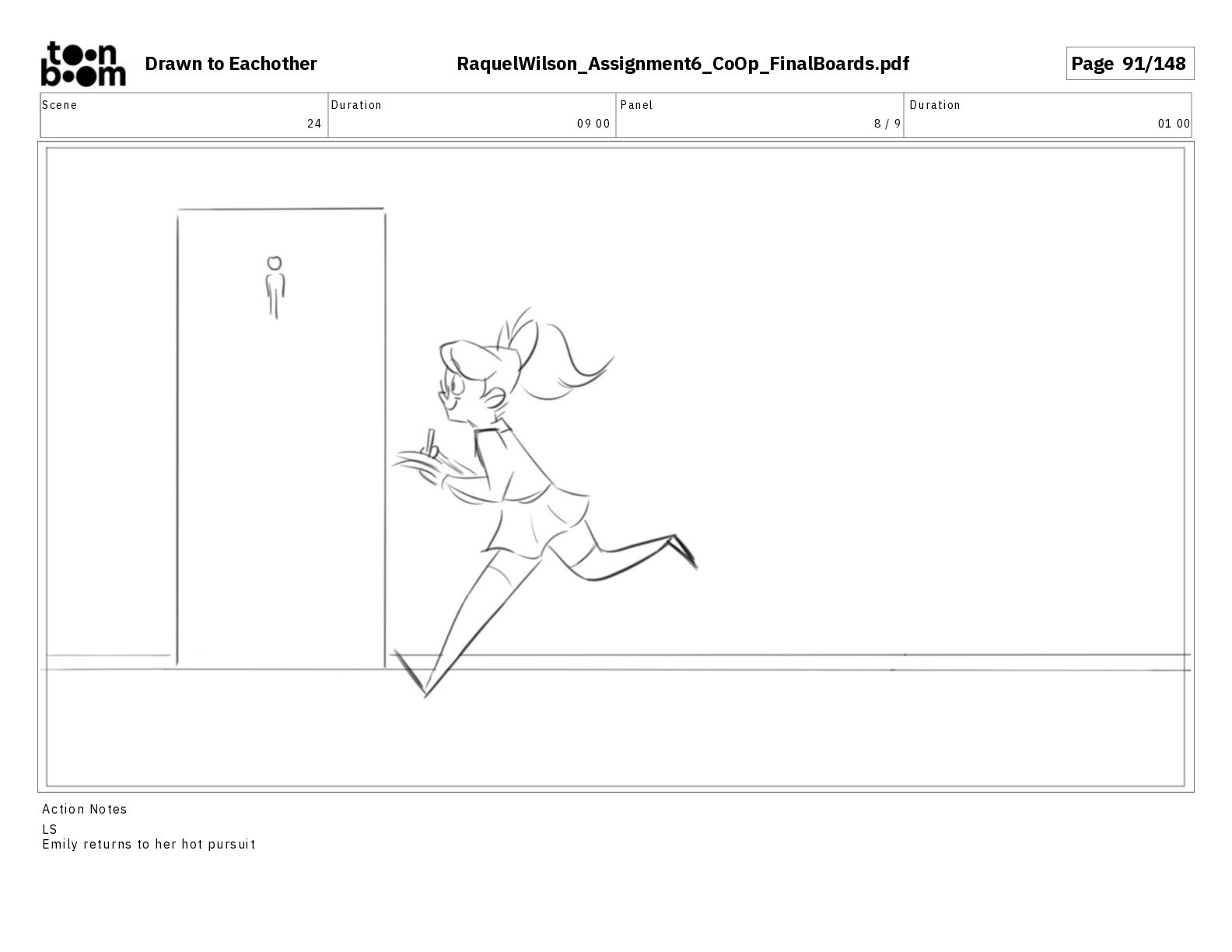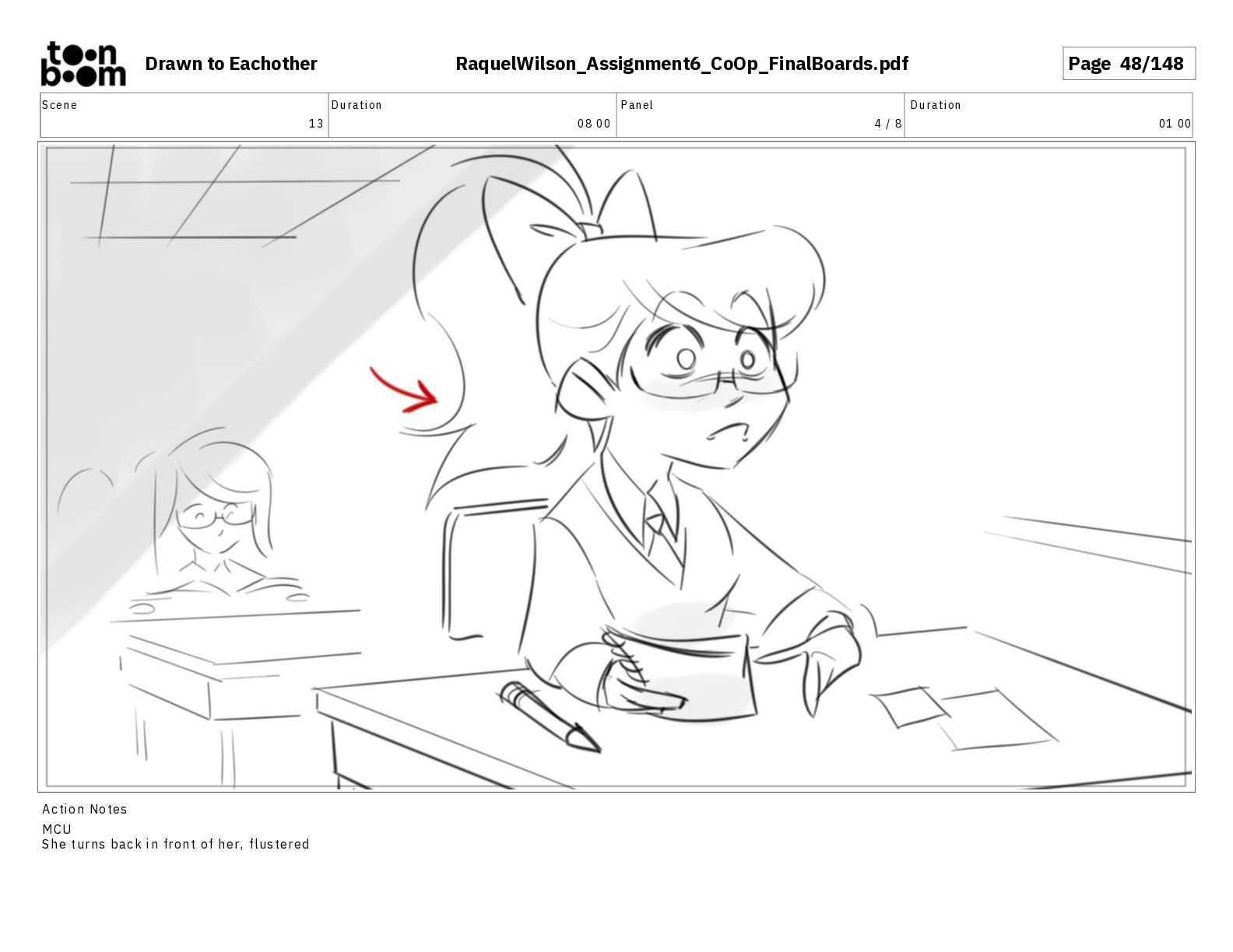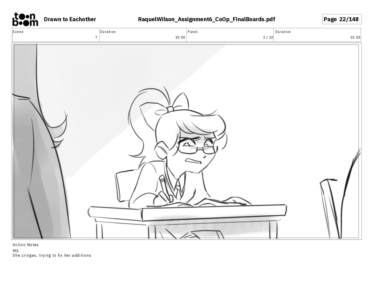 01 00 Action Notes MS She cringes, trying to fix her additions Drawn to Eachother RaquelWilson_Assignment6_CoOp_FinalBoards.pdf Page 22/148