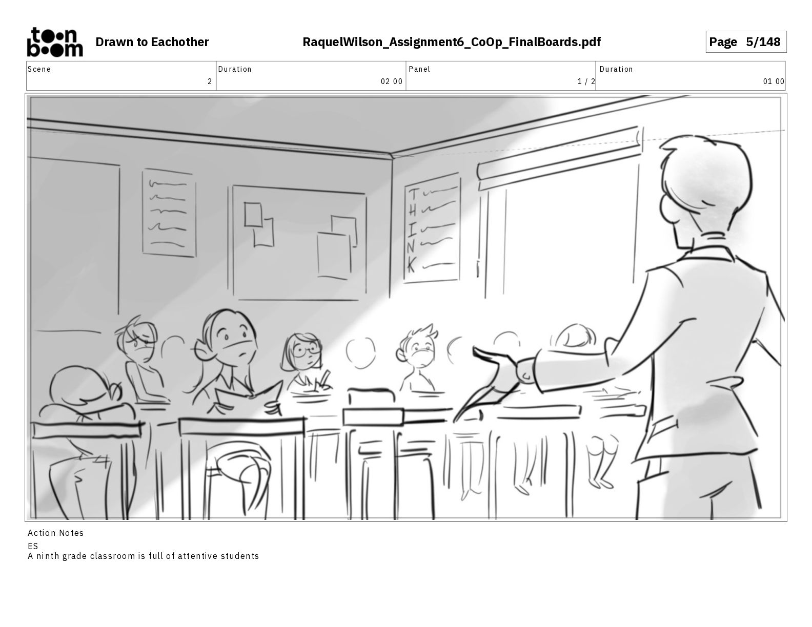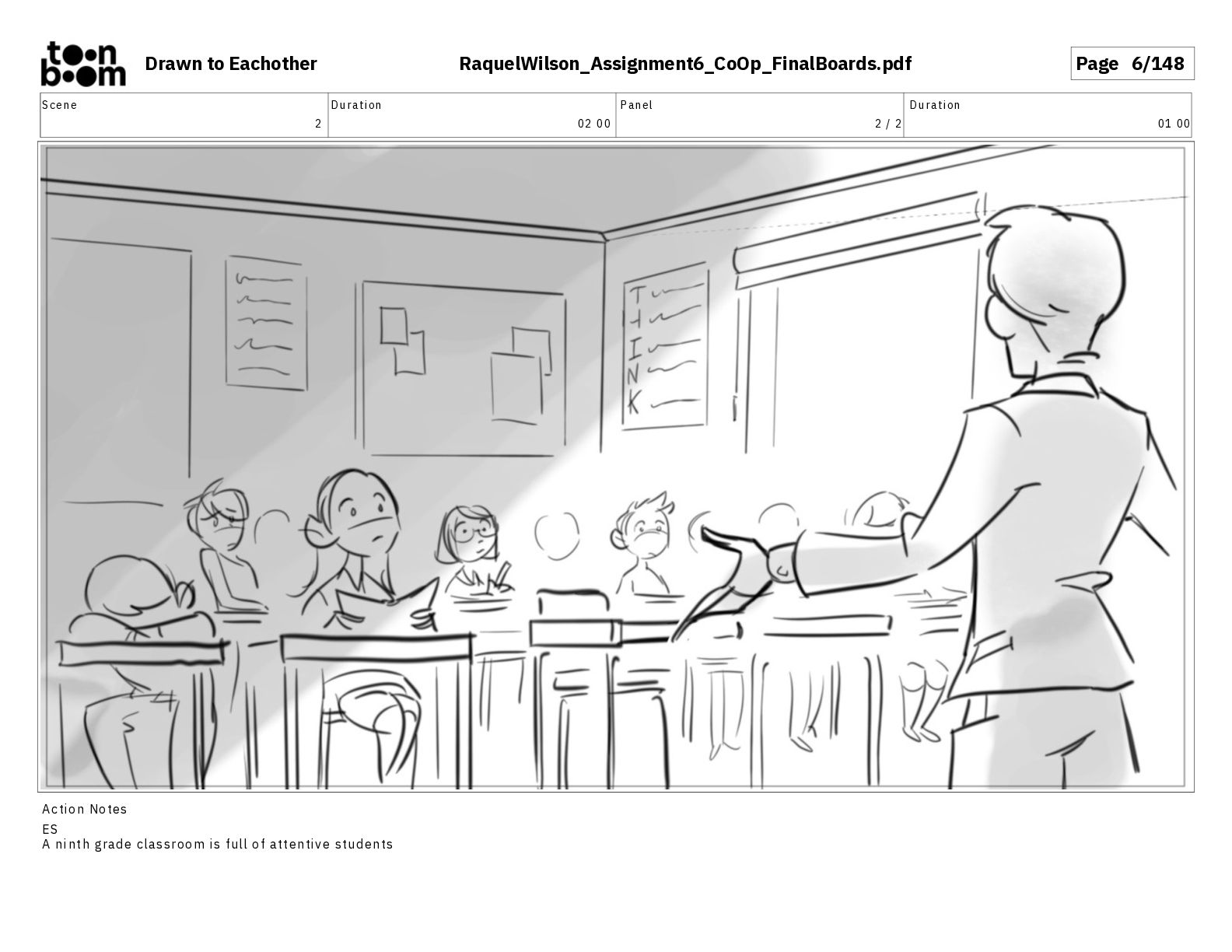 01 00 Action Notes ES A ninth grade classroom is full of attentive students Drawn to Eachother RaquelWilson_Assignment6_CoOp_FinalBoards.pdf Page 6/148