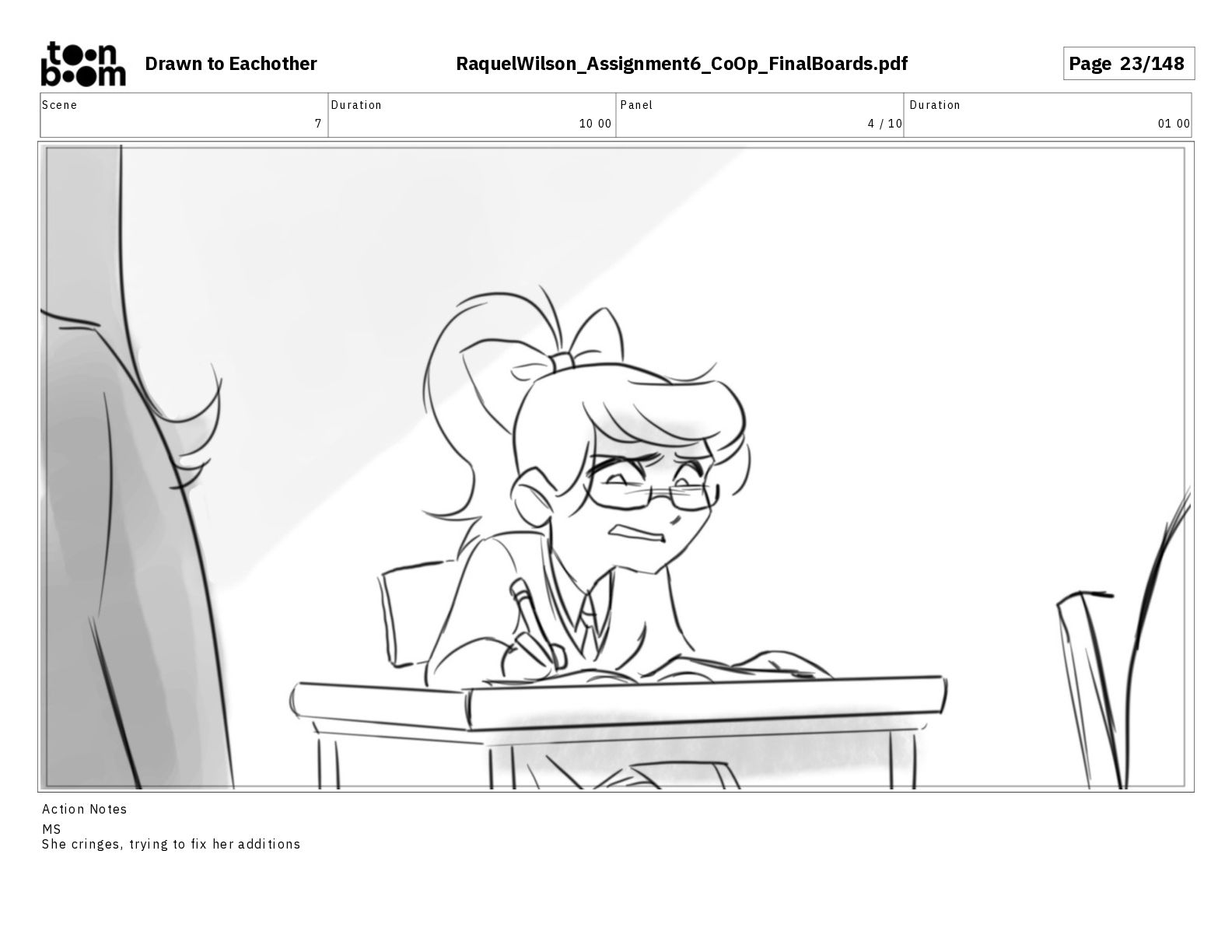 01 00 Action Notes MS She cringes, trying to fix her additions Drawn to Eachother RaquelWilson_Assignment6_CoOp_FinalBoards.pdf Page 23/148