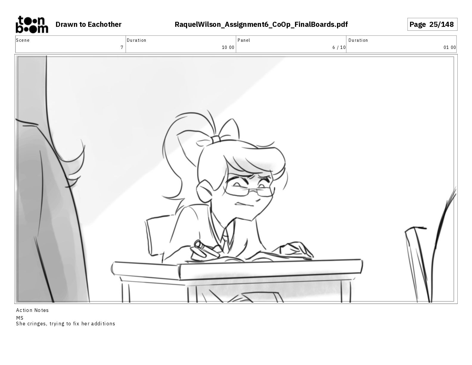 01 00 Action Notes MS She cringes, trying to fix her additions Drawn to Eachother RaquelWilson_Assignment6_CoOp_FinalBoards.pdf Page 25/148