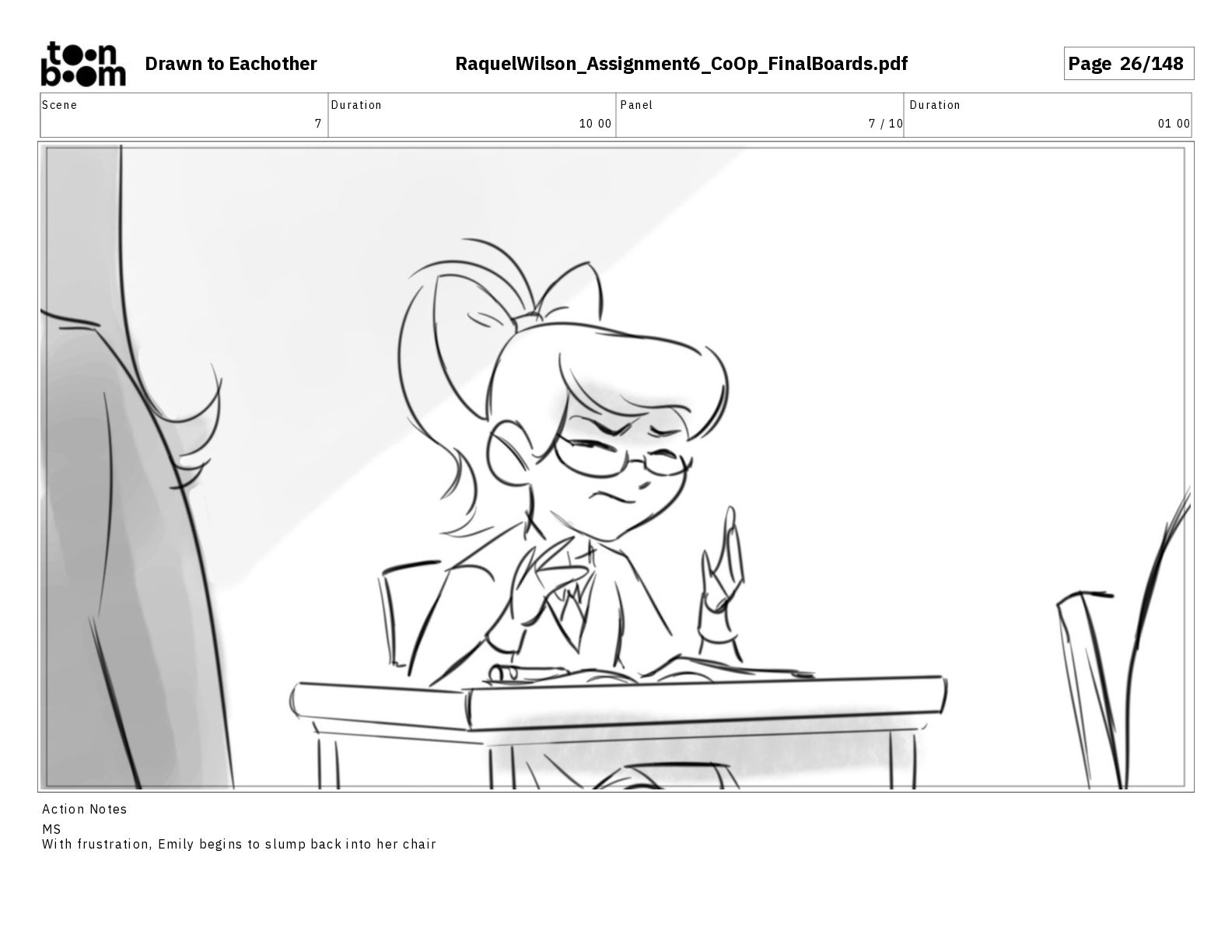 01 00 Action Notes MS With frustration, Emily begins to slump back into her chair Drawn to Eachother RaquelWilson_Assignment6_CoOp_FinalBoards.pdf Page 26/148