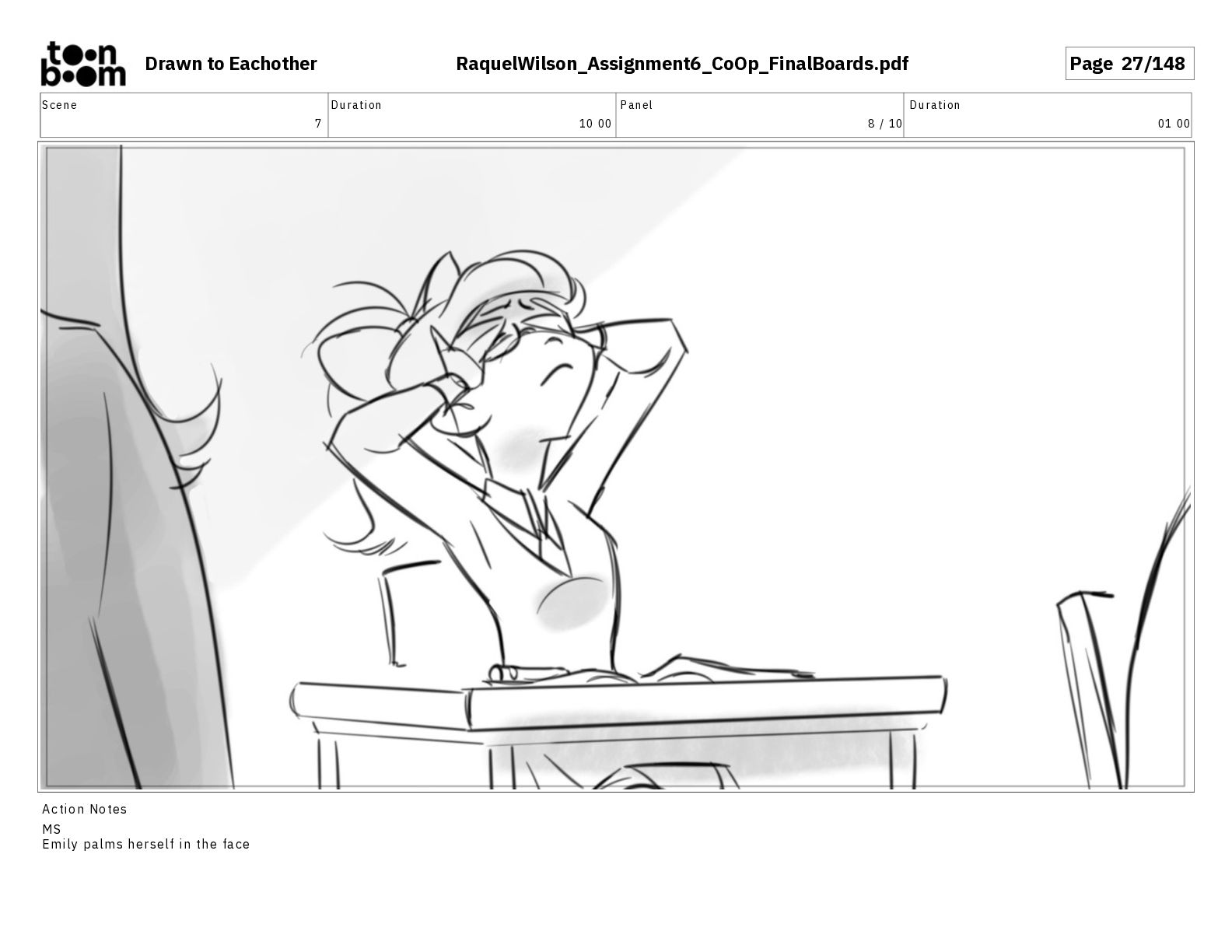 01 00 Action Notes MS Emily palms herself in the face Drawn to Eachother RaquelWilson_Assignment6_CoOp_FinalBoards.pdf Page 27/148