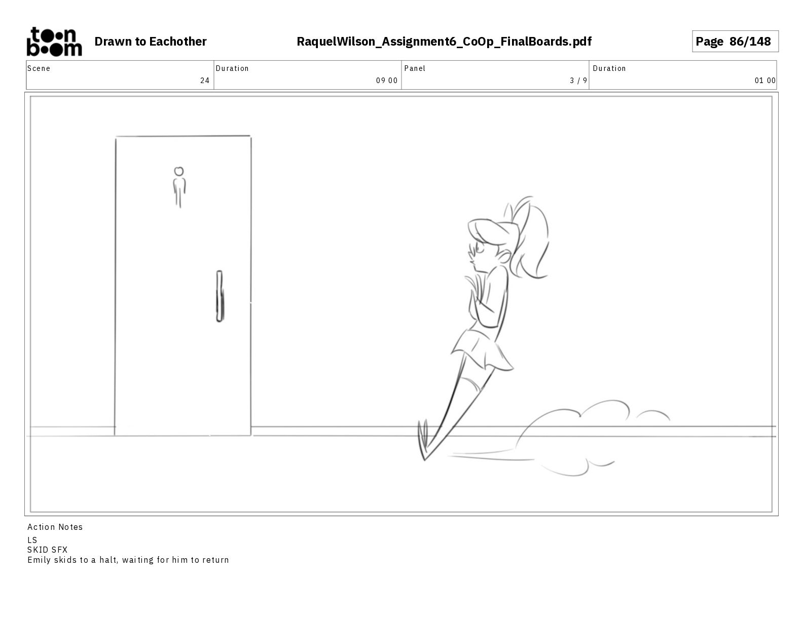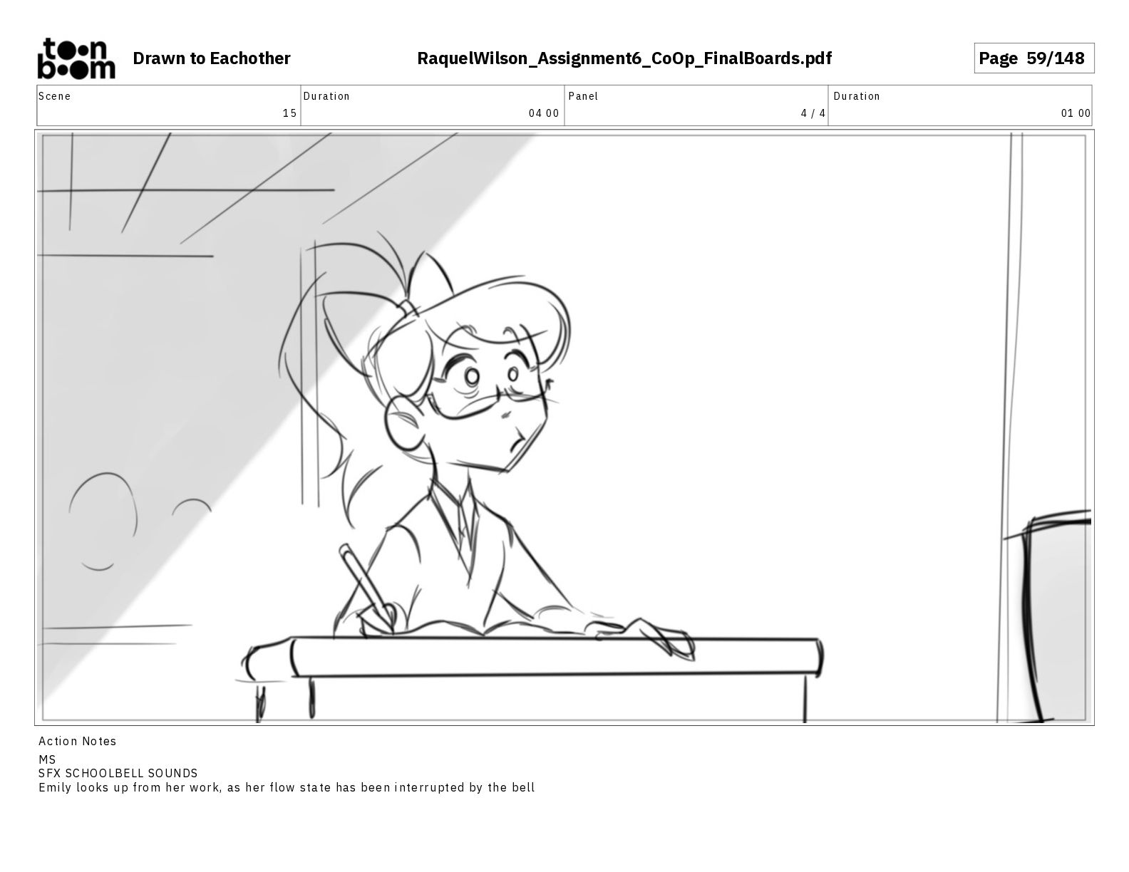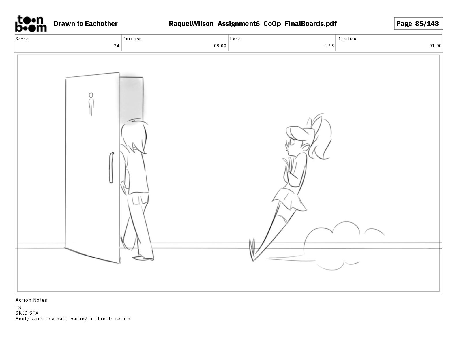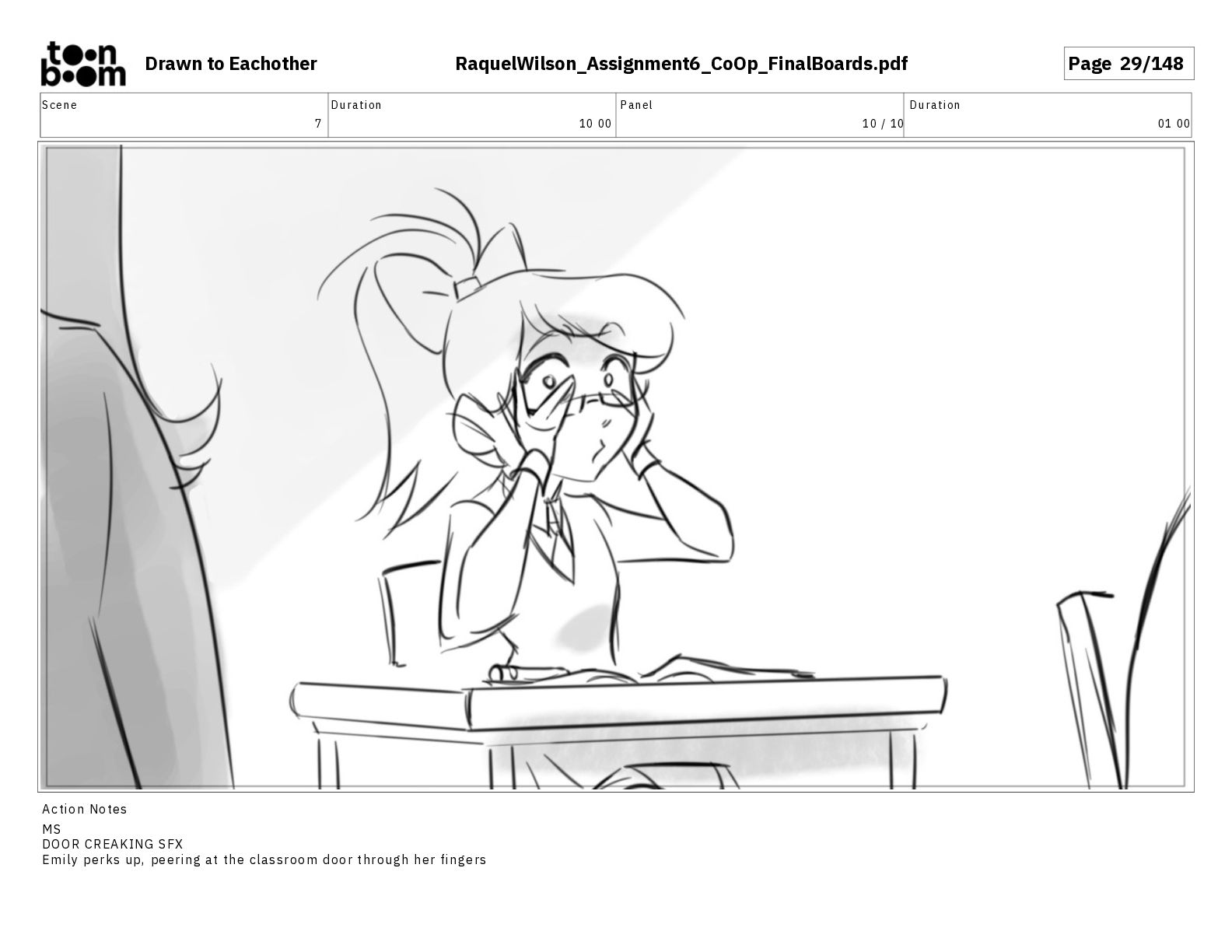 01 00 Action Notes MS DOOR CREAKING SFX Emily perks up, peering at the classroom door through her fingers Drawn to Eachother RaquelWilson_Assignment6_CoOp_FinalBoards.pdf Page 29/148