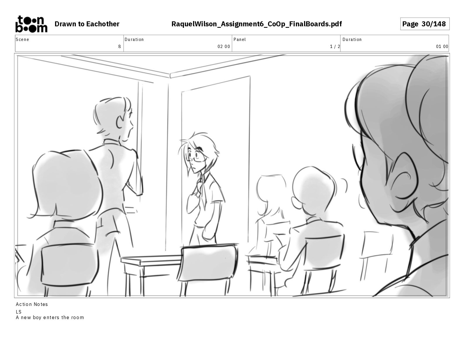 01 00 Action Notes LS A new boy enters the room Drawn to Eachother RaquelWilson_Assignment6_CoOp_FinalBoards.pdf Page 30/148