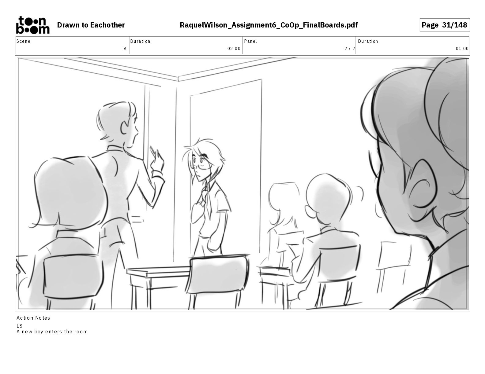 01 00 Action Notes LS A new boy enters the room Drawn to Eachother RaquelWilson_Assignment6_CoOp_FinalBoards.pdf Page 31/148