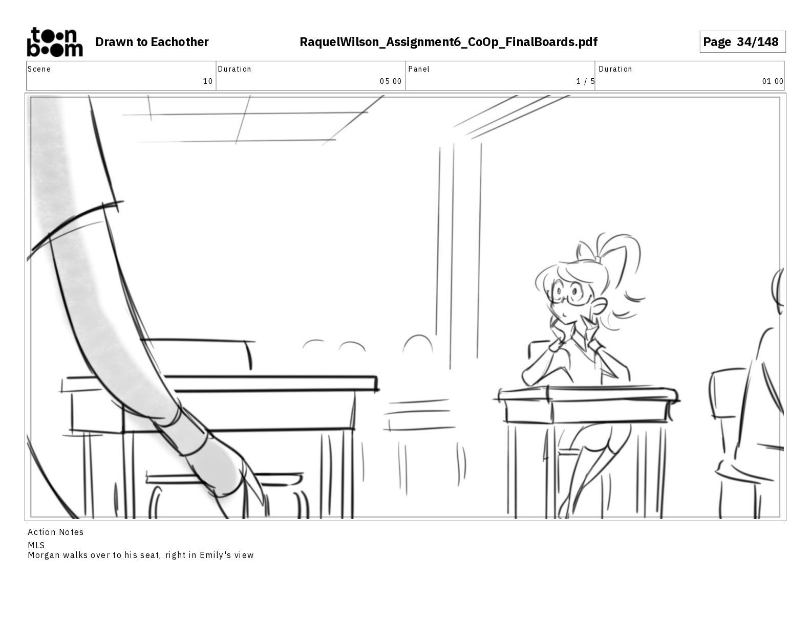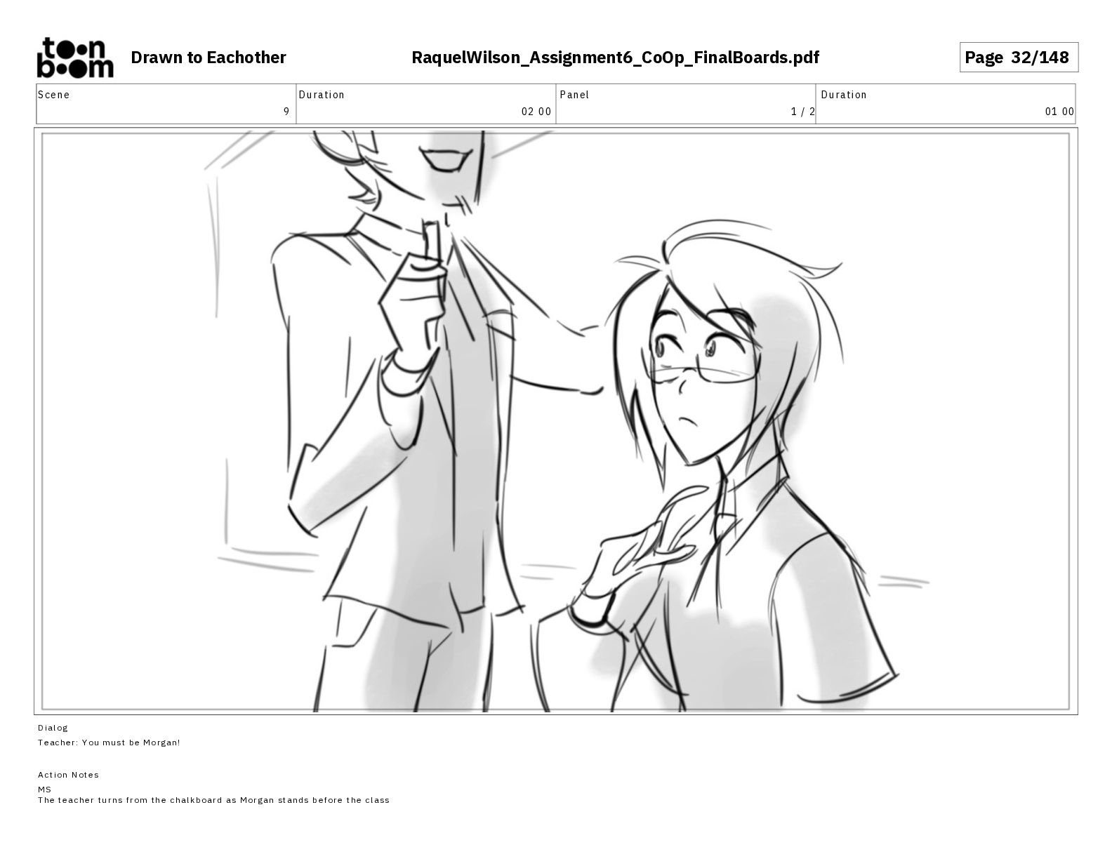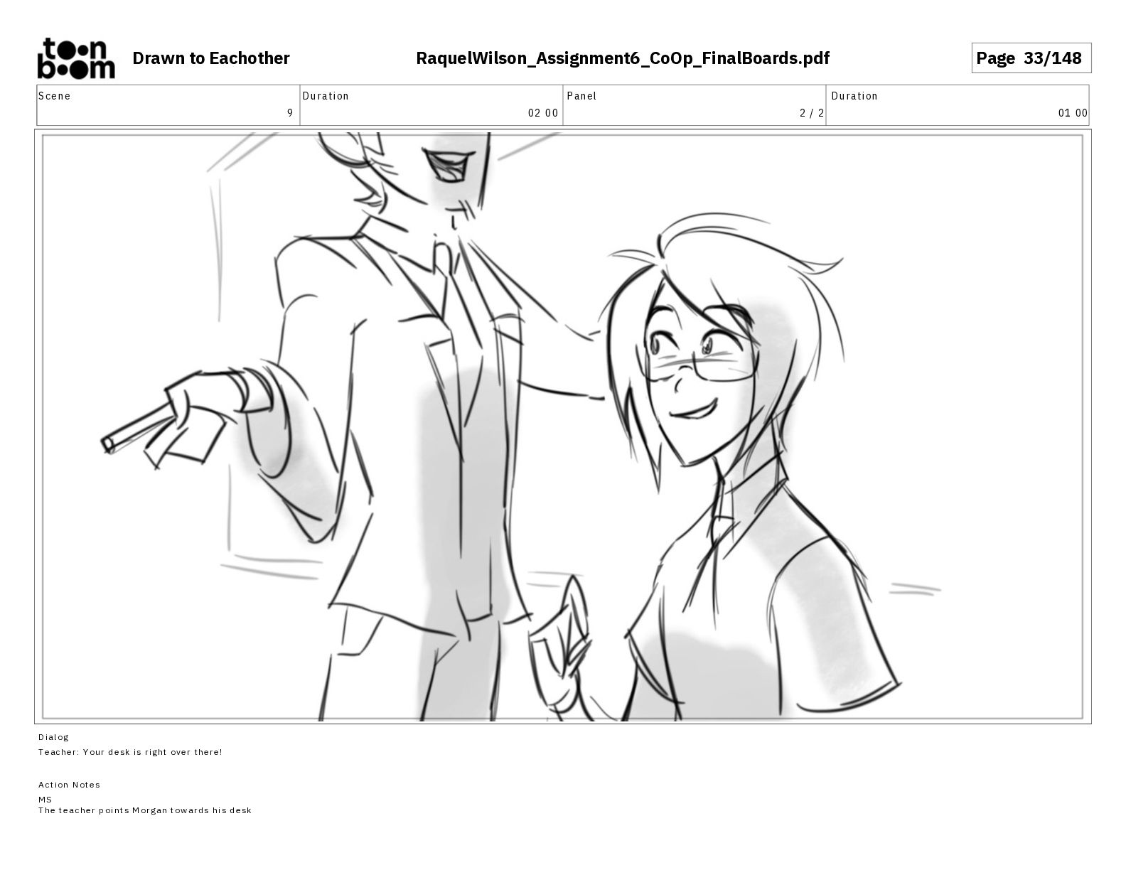 01 00 Dialog Teacher: Your desk is right over there! Action Notes MS The teacher points Morgan towards his desk Drawn to Eachother RaquelWilson_Assignment6_CoOp_FinalBoards.pdf Page 33/148