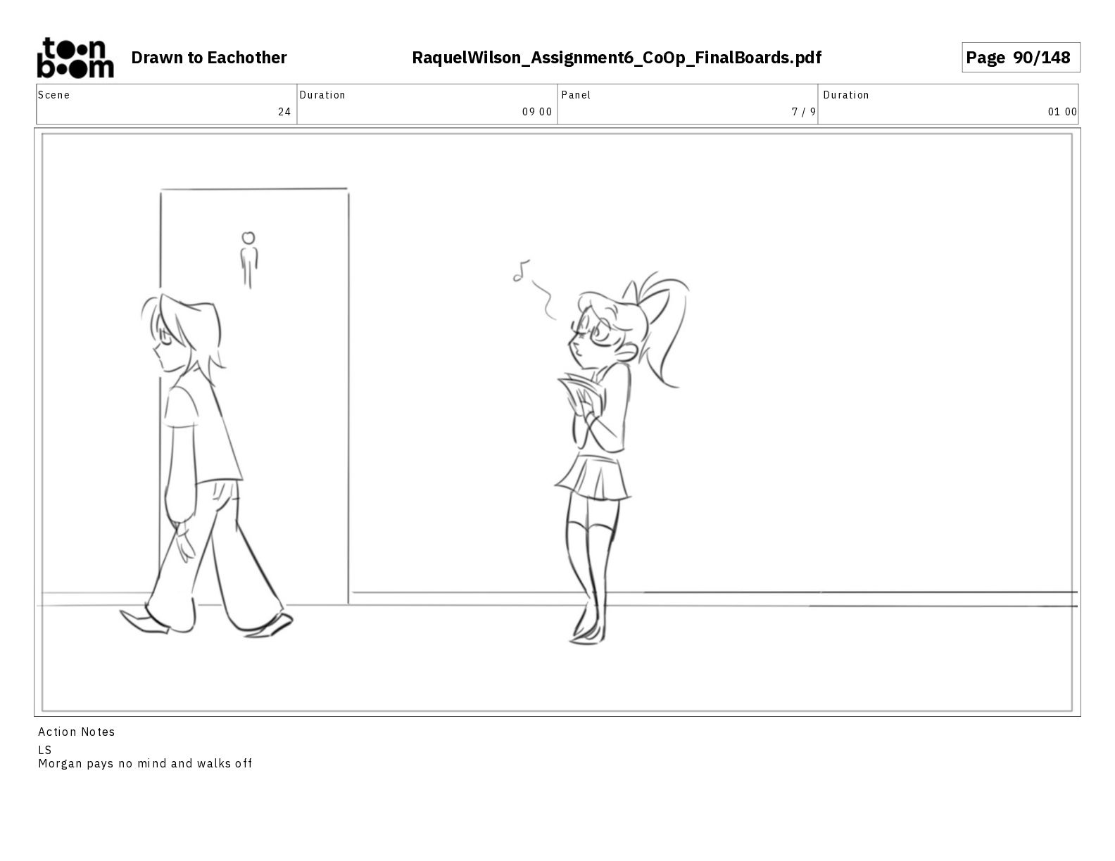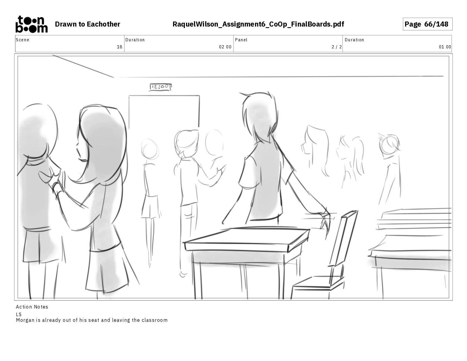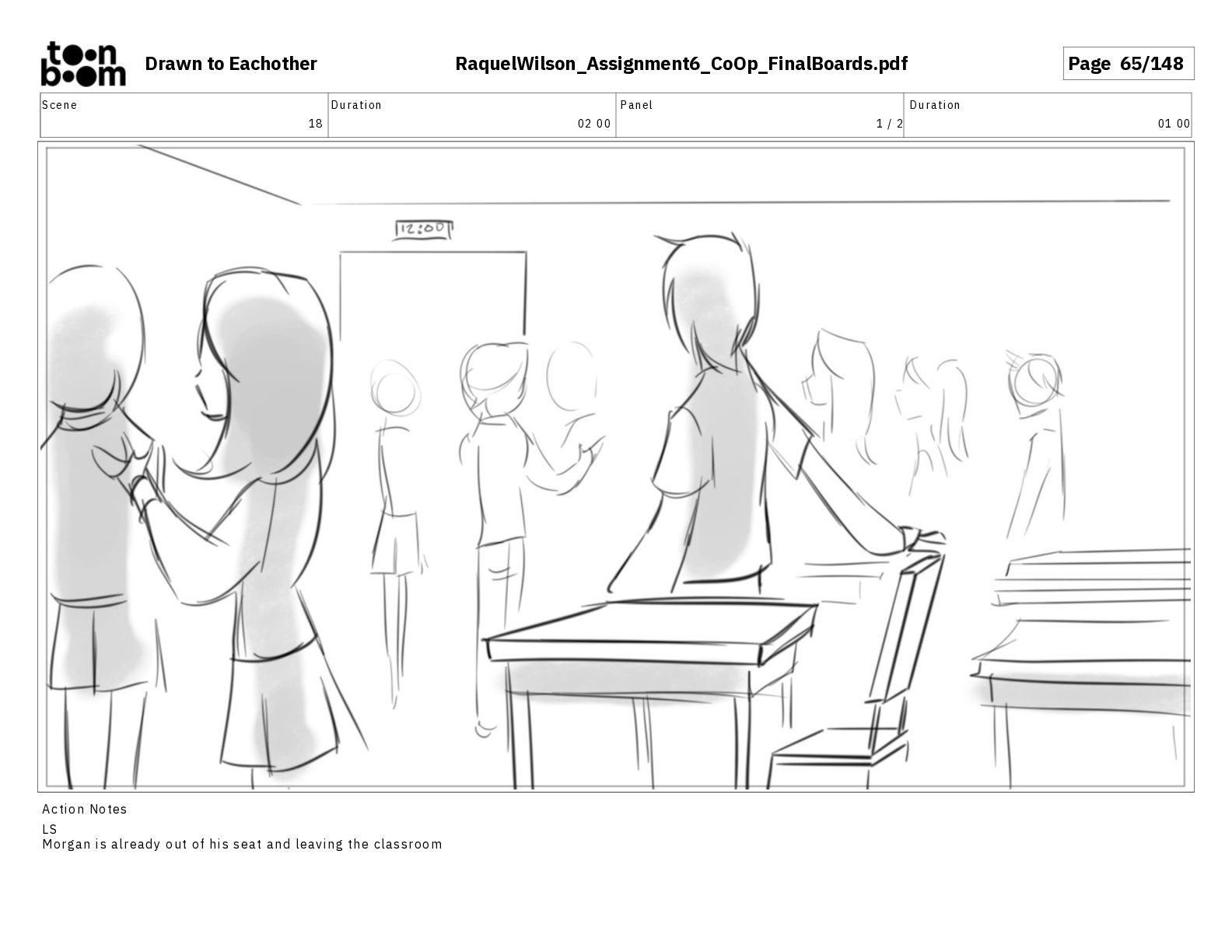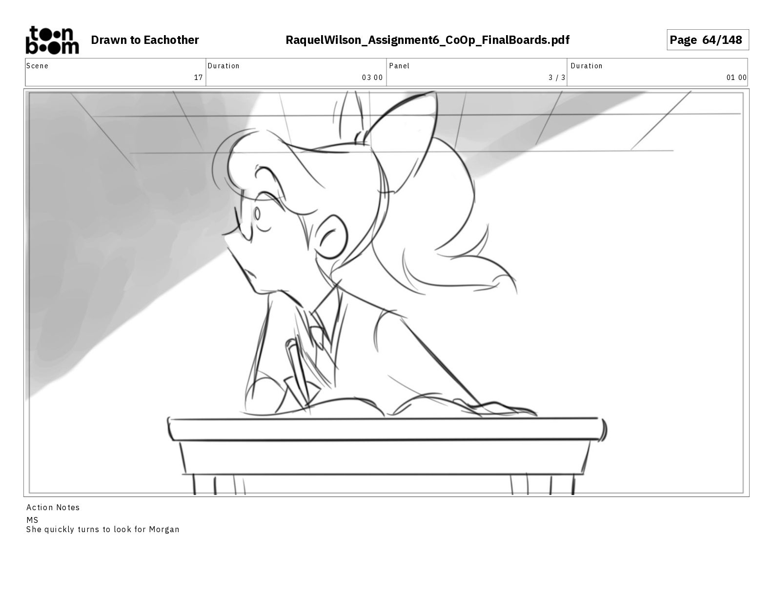 01 00 Dialog Teacher: Your desk is right over there! Action Notes MS The teacher points Morgan towards his desk Drawn to Eachother RaquelWilson_Assignment6_CoOp_FinalBoards.pdf Page 33/148