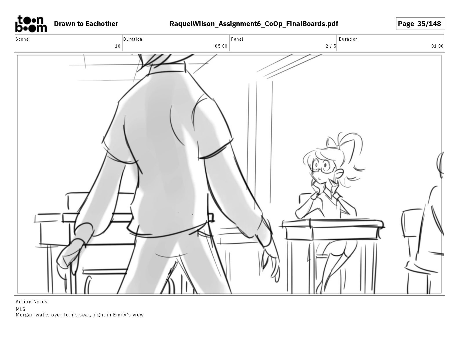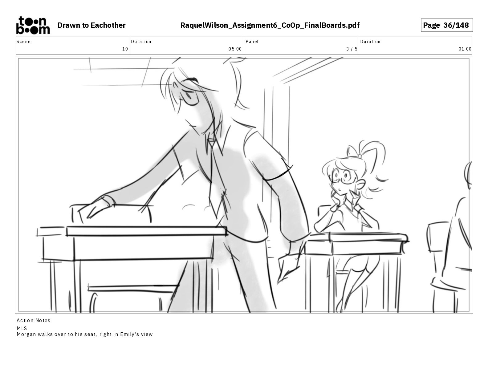 01 00 Action Notes MLS Morgan walks over to his seat, right in Emily's view Drawn to Eachother RaquelWilson_Assignment6_CoOp_FinalBoards.pdf Page 36/148