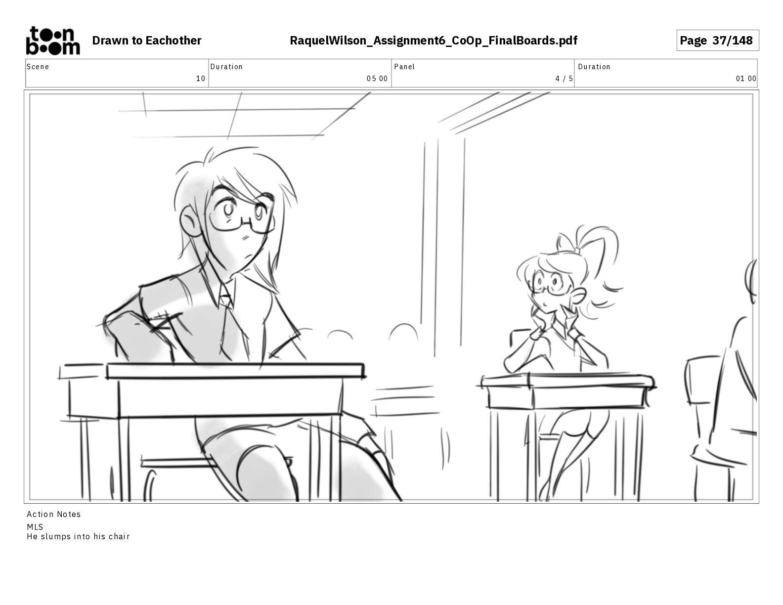 01 00 Action Notes MLS He slumps into his chair Drawn to Eachother RaquelWilson_Assignment6_CoOp_FinalBoards.pdf Page 37/148