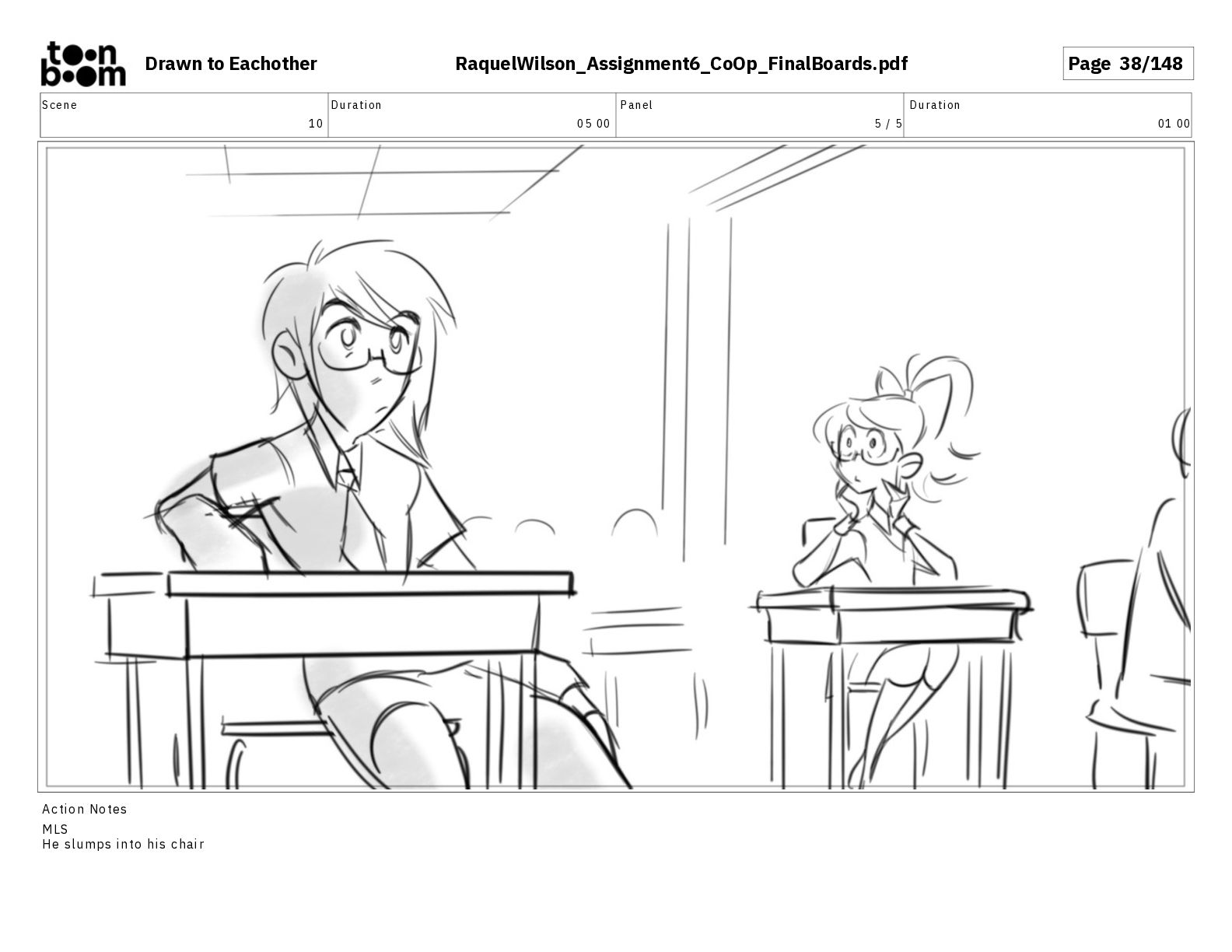 01 00 Action Notes MLS He slumps into his chair Drawn to Eachother RaquelWilson_Assignment6_CoOp_FinalBoards.pdf Page 38/148
