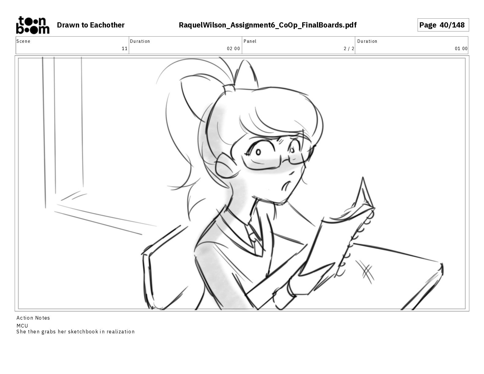 01 00 Action Notes MCU She then grabs her sketchbook in realization Drawn to Eachother RaquelWilson_Assignment6_CoOp_FinalBoards.pdf Page 40/148