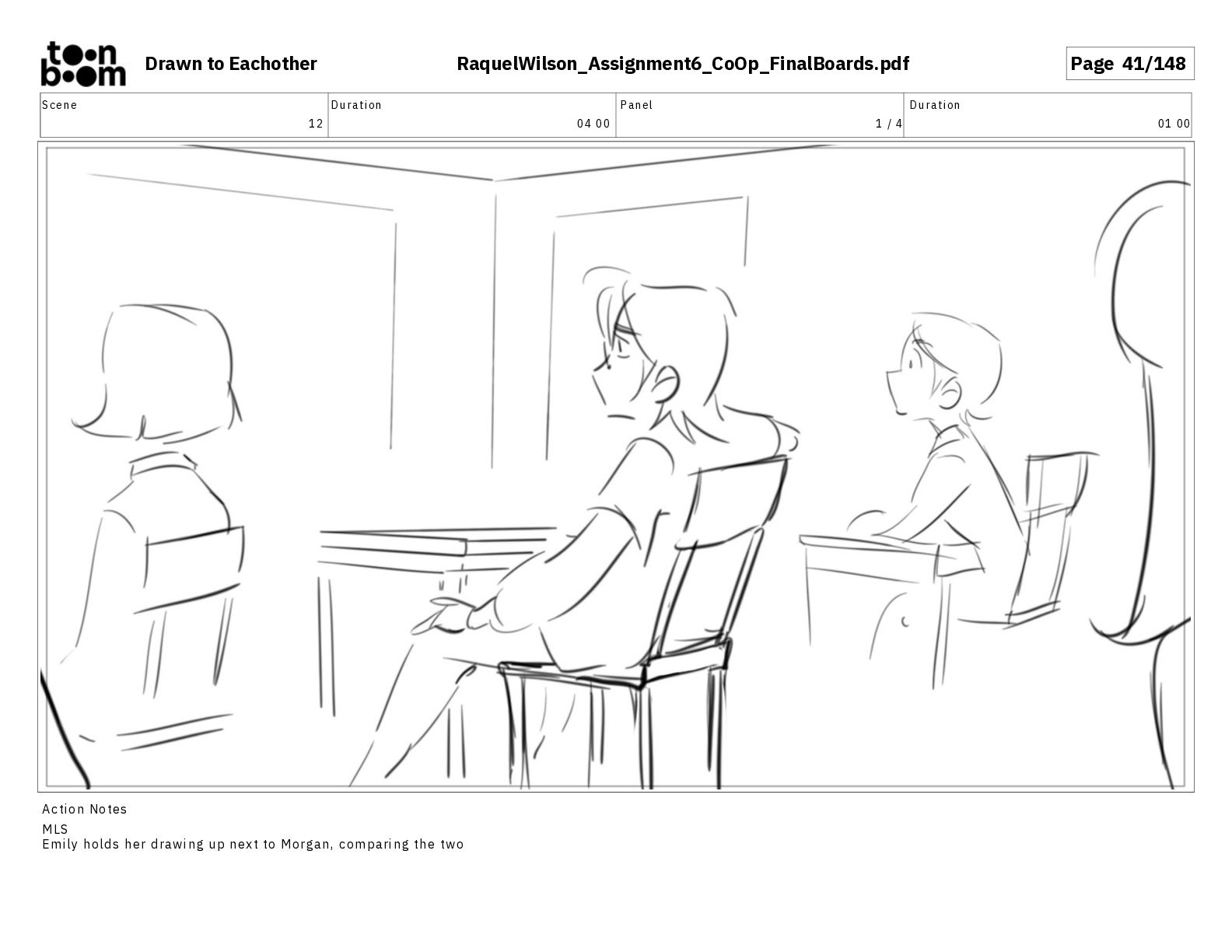 01 00 Action Notes MLS Emily holds her drawing up next to Morgan, comparing the two Drawn to Eachother RaquelWilson_Assignment6_CoOp_FinalBoards.pdf Page 41/148