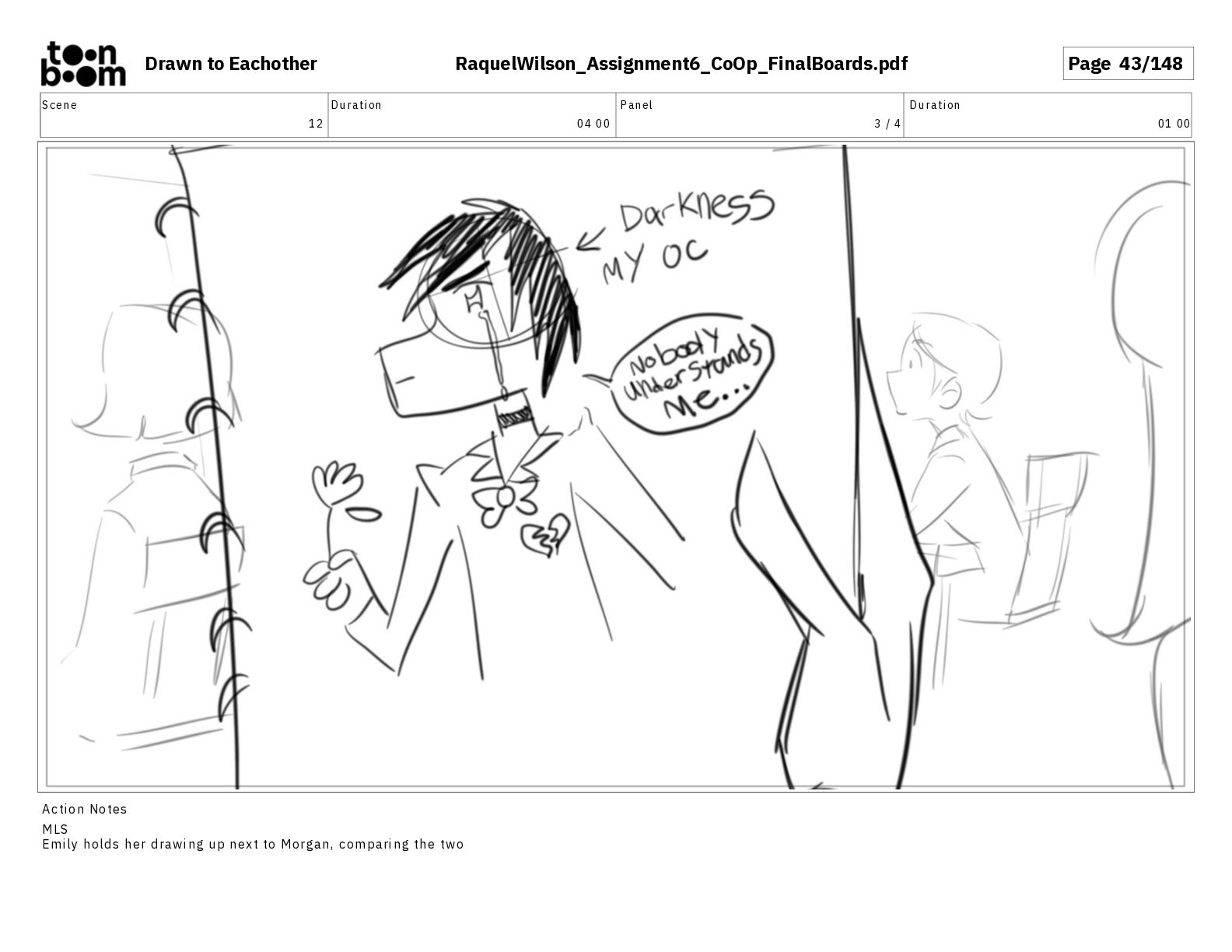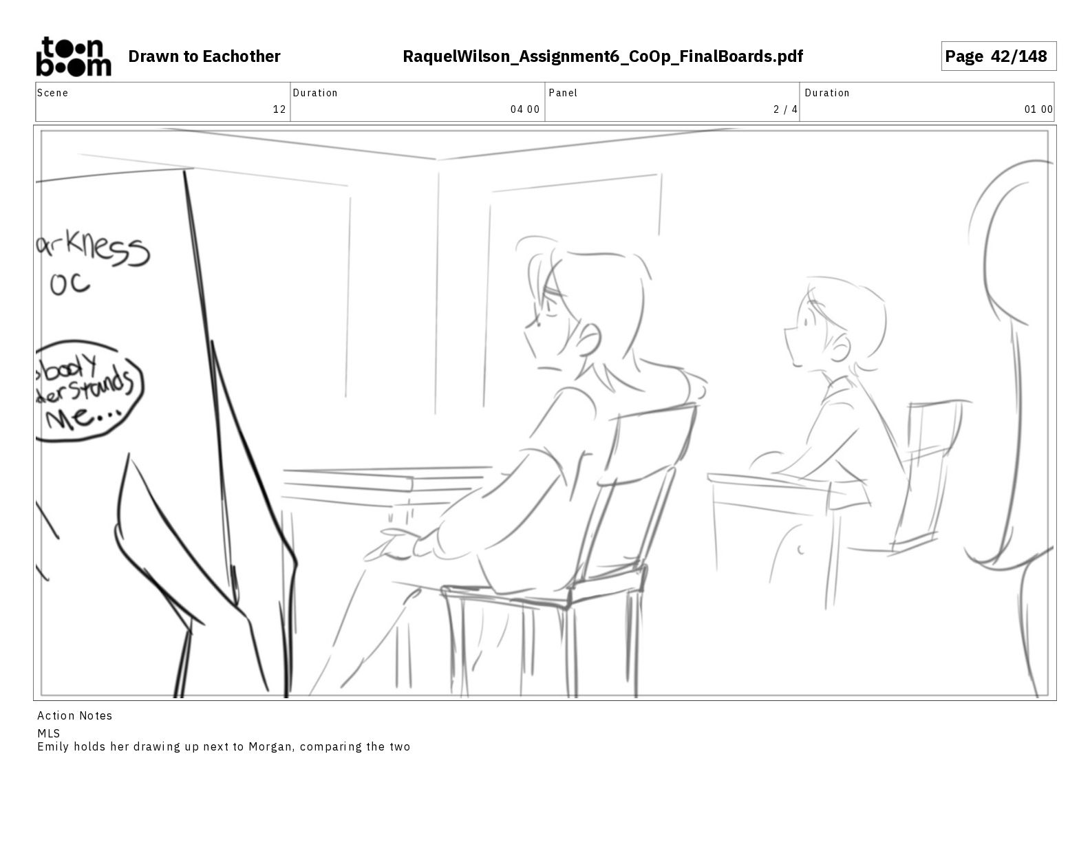 01 00 Action Notes MLS Emily holds her drawing up next to Morgan, comparing the two Drawn to Eachother RaquelWilson_Assignment6_CoOp_FinalBoards.pdf Page 42/148