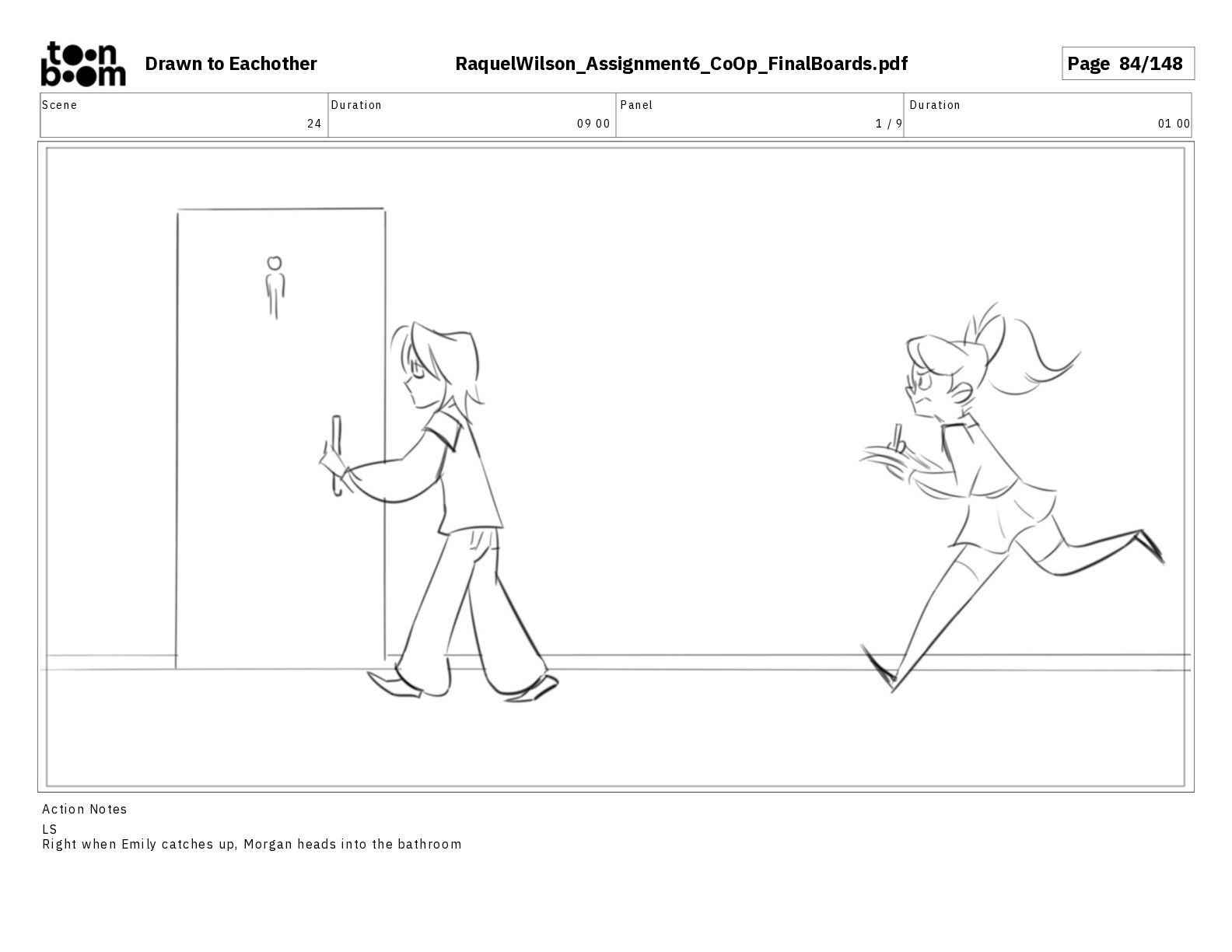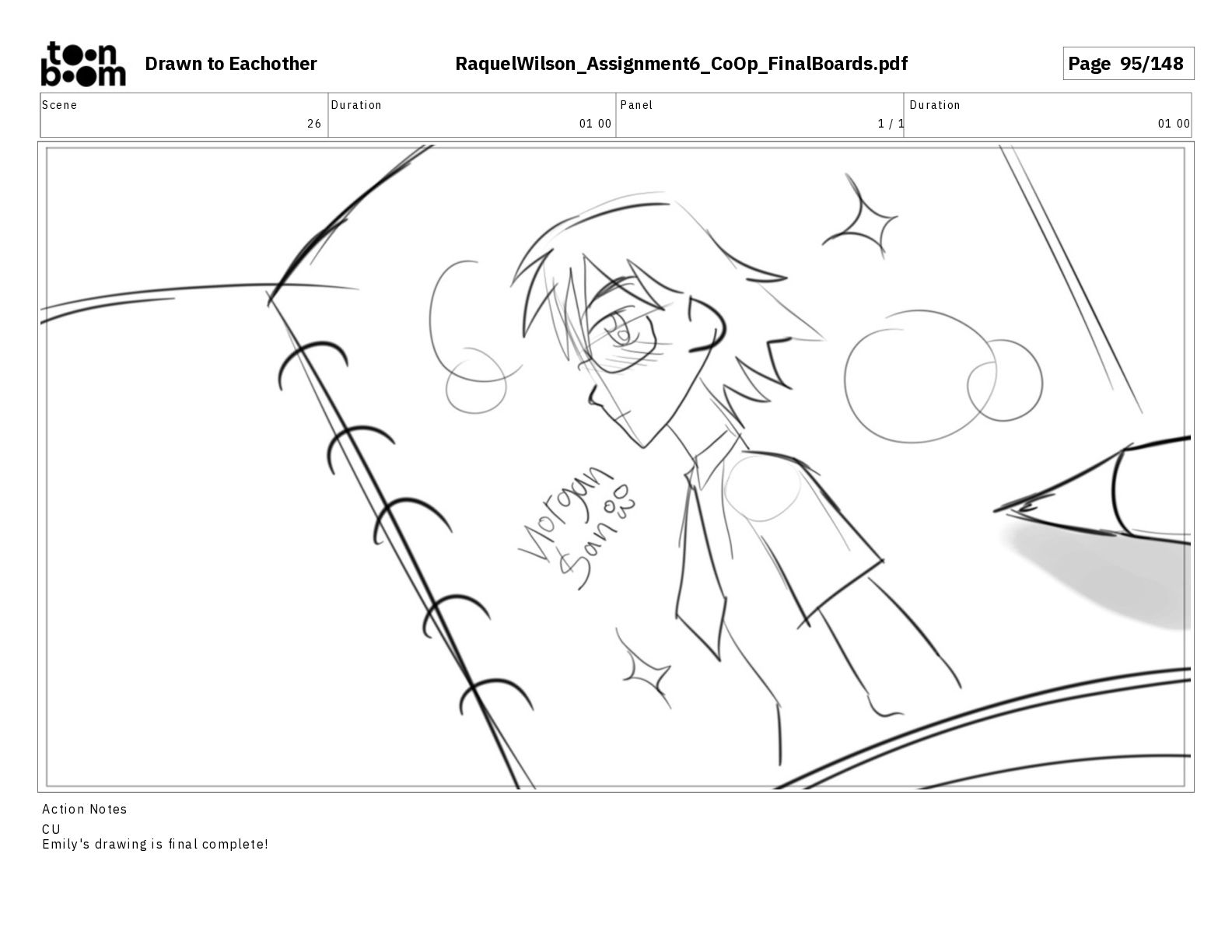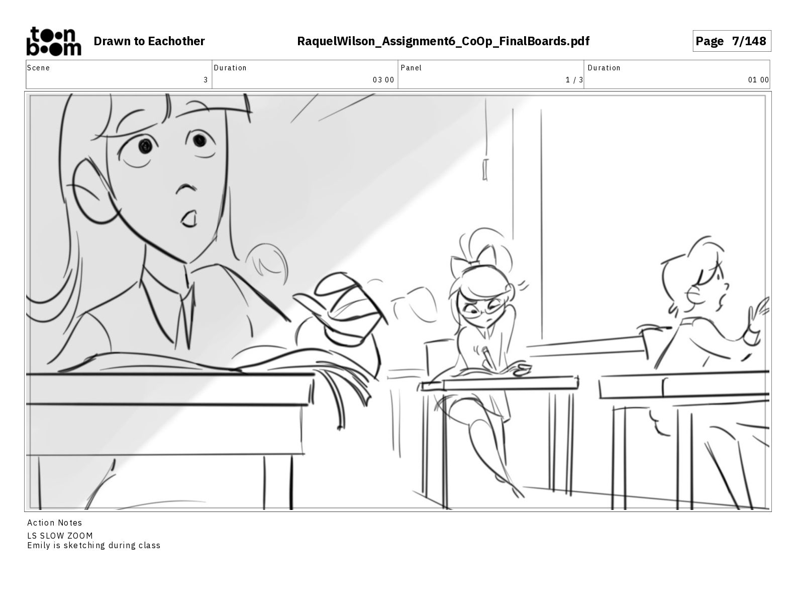01 00 Action Notes LS SLOW ZOOM Emily is sketching during class Drawn to Eachother RaquelWilson_Assignment6_CoOp_FinalBoards.pdf Page 7/148