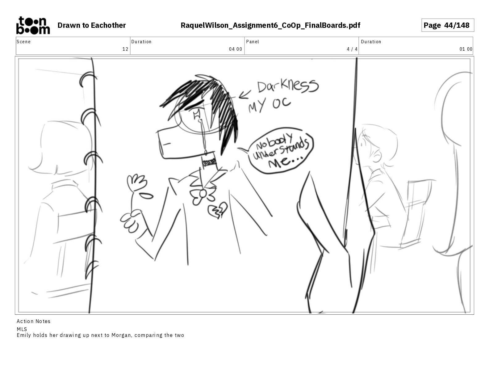 01 00 Action Notes MLS Emily holds her drawing up next to Morgan, comparing the two Drawn to Eachother RaquelWilson_Assignment6_CoOp_FinalBoards.pdf Page 44/148