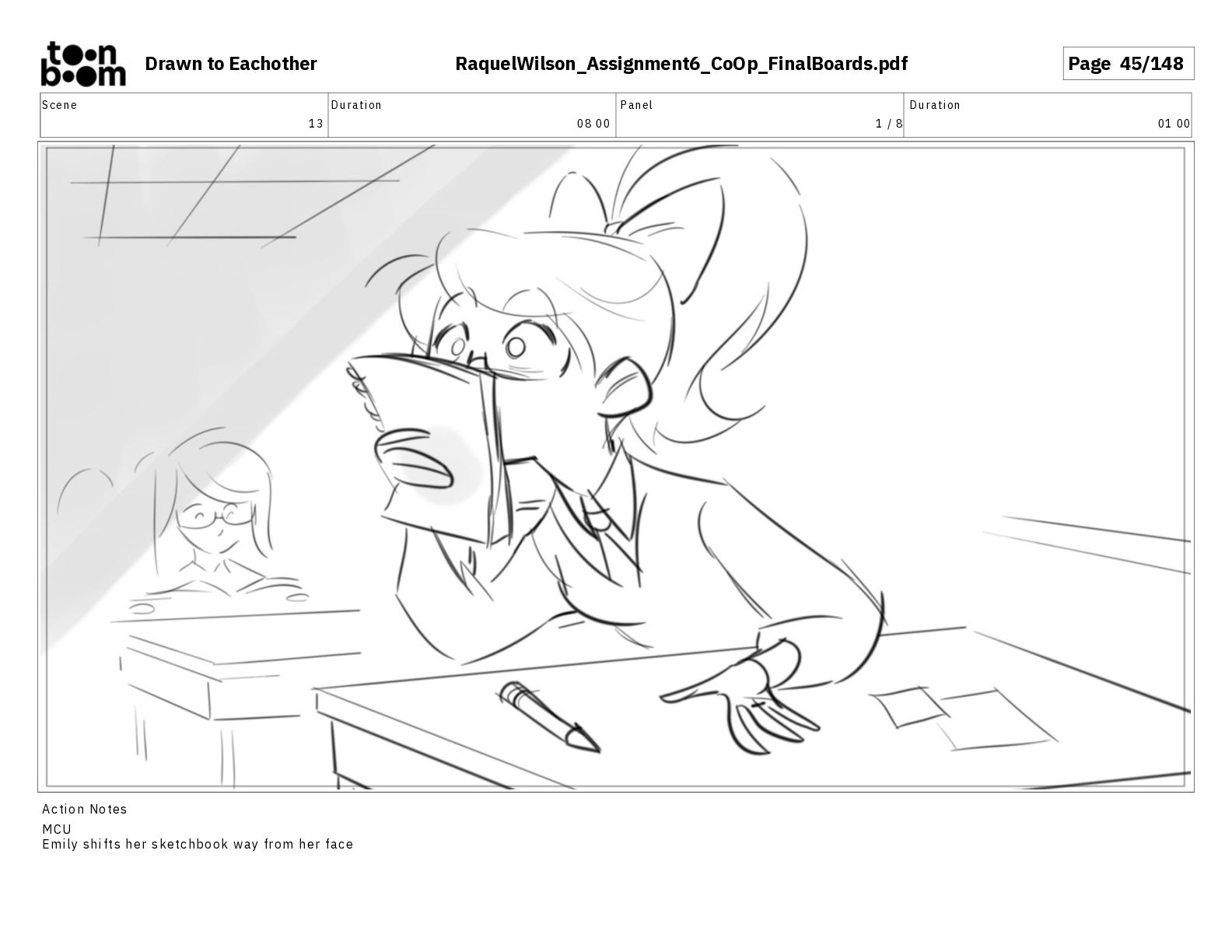 01 00 Action Notes MCU Emily shifts her sketchbook way from her face Drawn to Eachother RaquelWilson_Assignment6_CoOp_FinalBoards.pdf Page 45/148