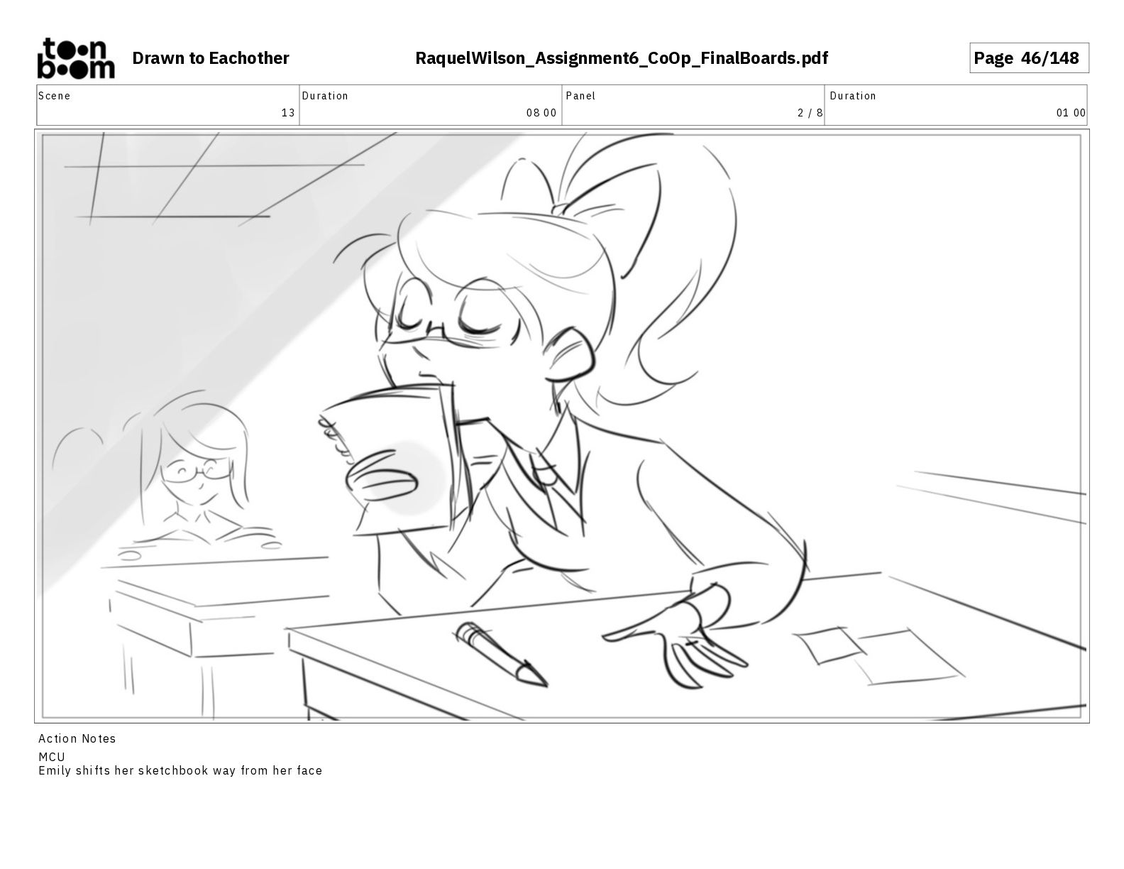 01 00 Action Notes MCU Emily shifts her sketchbook way from her face Drawn to Eachother RaquelWilson_Assignment6_CoOp_FinalBoards.pdf Page 46/148