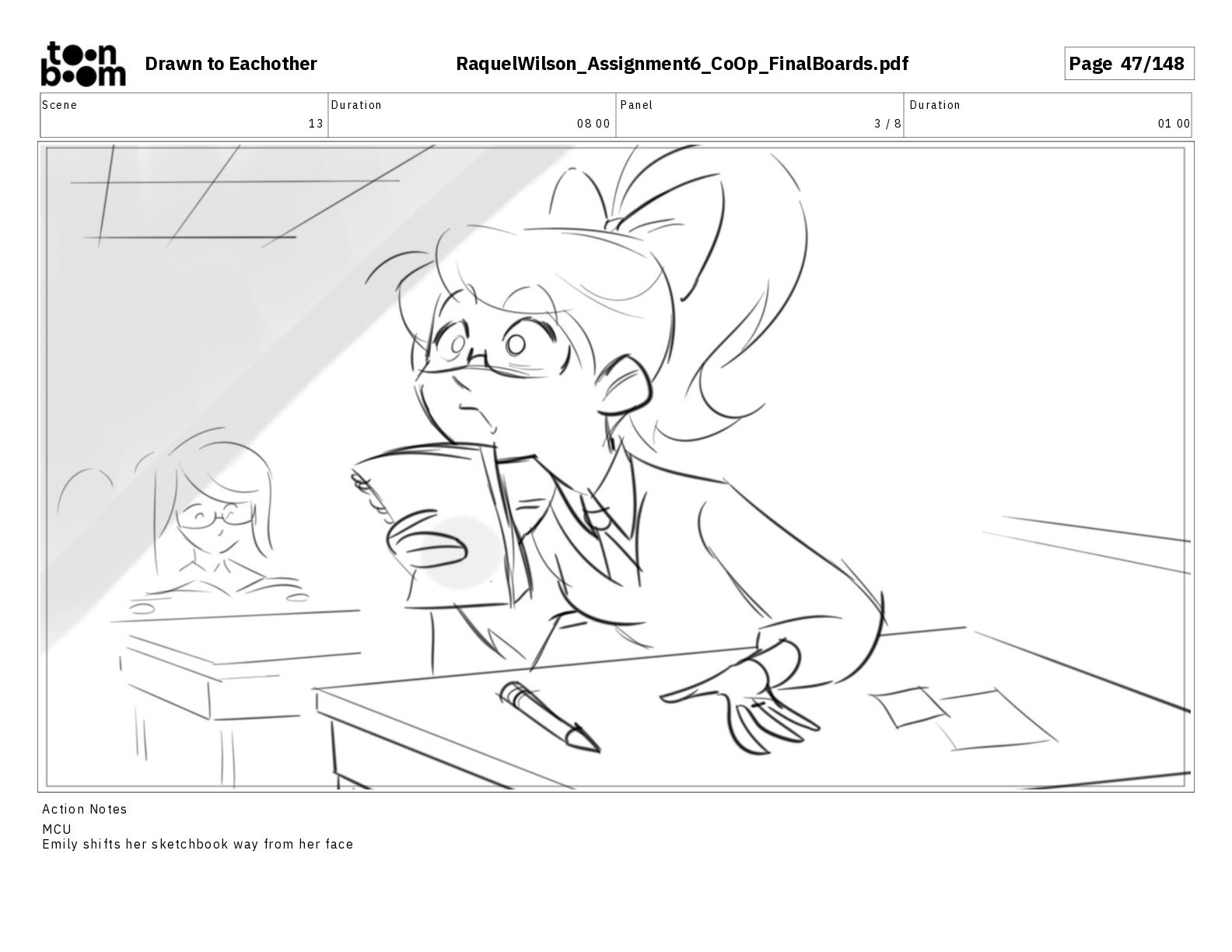 01 00 Action Notes MCU Emily shifts her sketchbook way from her face Drawn to Eachother RaquelWilson_Assignment6_CoOp_FinalBoards.pdf Page 47/148