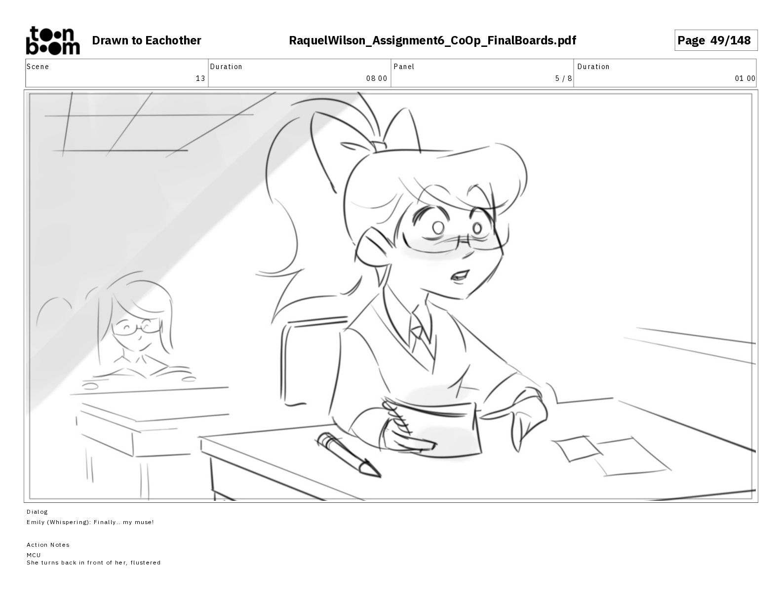 01 00 Action Notes MCU Emily thinks for a moment, tapping her pencil to her chin Drawn to Eachother RaquelWilson_Assignment6_CoOp_FinalBoards.pdf Page 14/148
