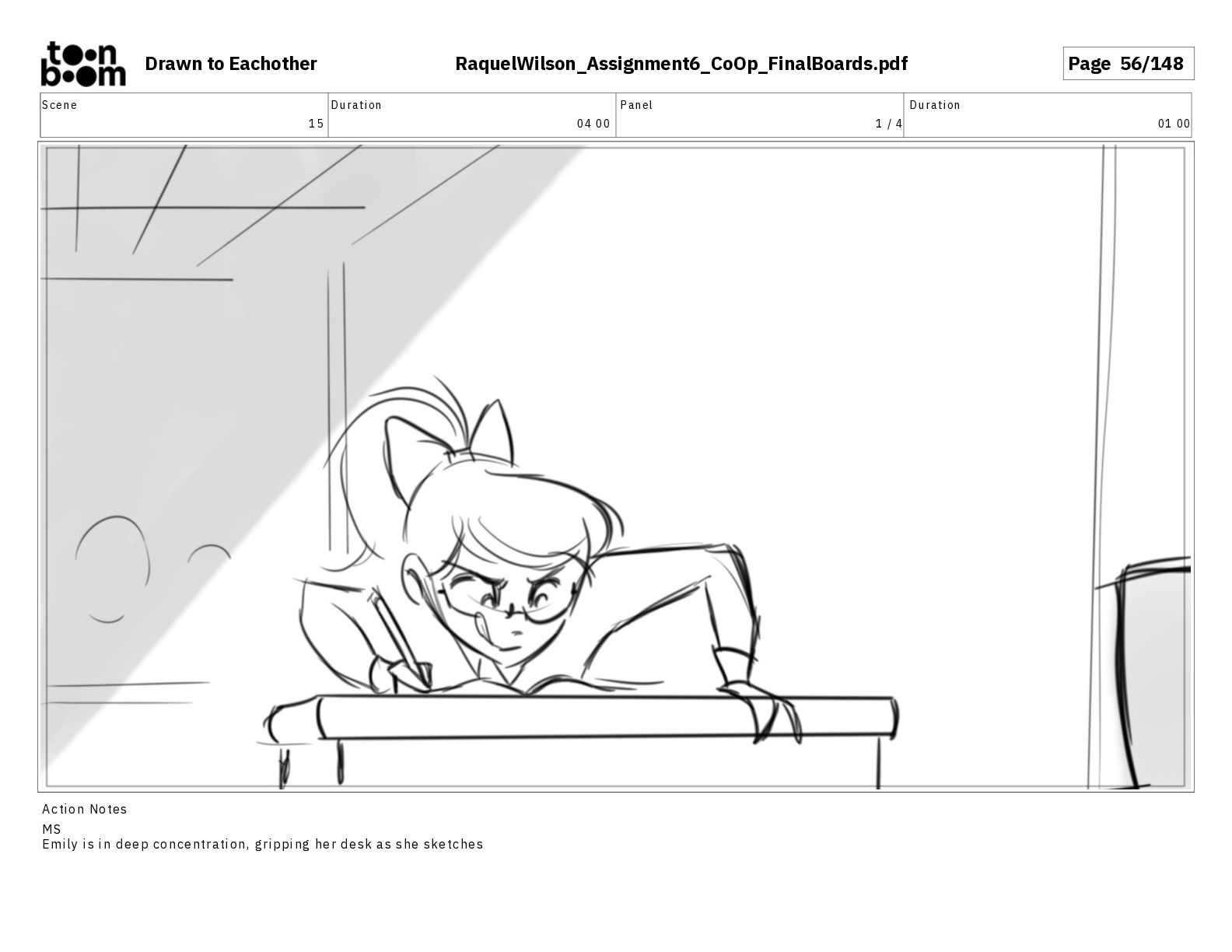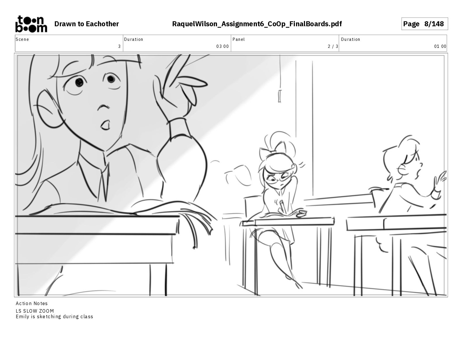 01 00 Action Notes LS SLOW ZOOM Emily is sketching during class Drawn to Eachother RaquelWilson_Assignment6_CoOp_FinalBoards.pdf Page 8/148