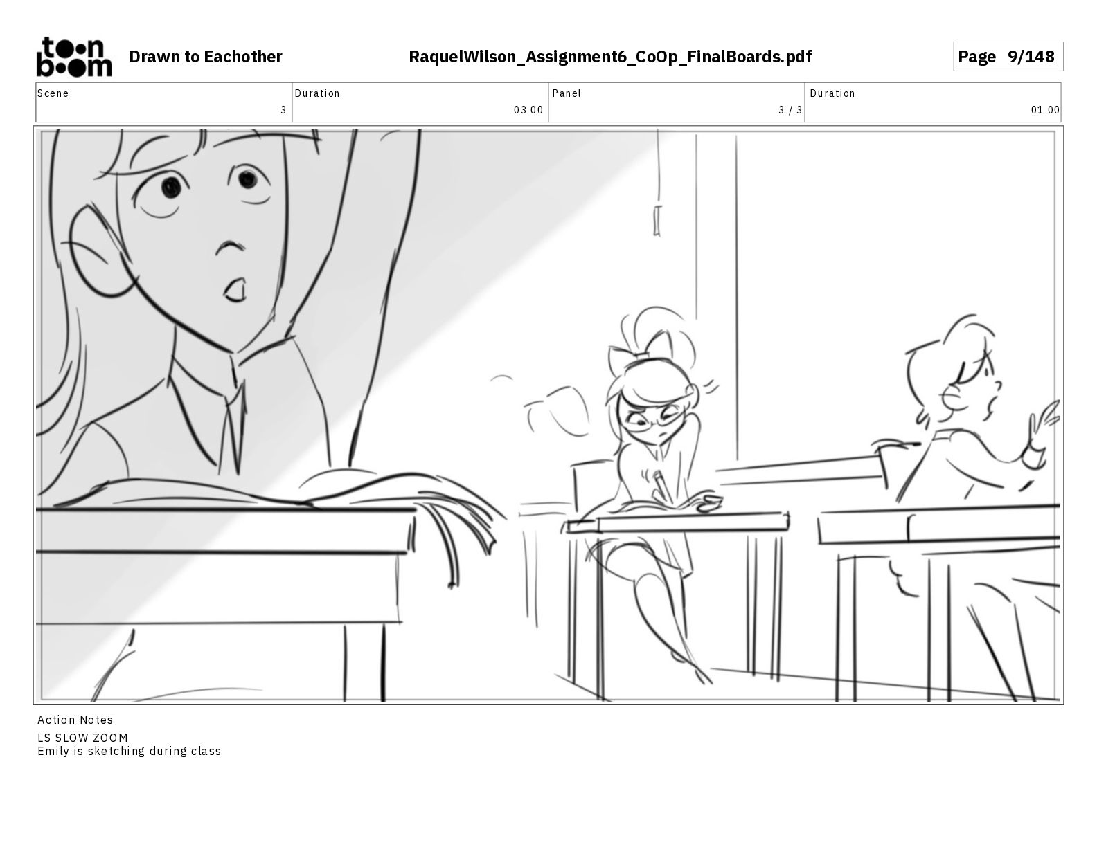 01 00 Action Notes LS SLOW ZOOM Emily is sketching during class Drawn to Eachother RaquelWilson_Assignment6_CoOp_FinalBoards.pdf Page 9/148