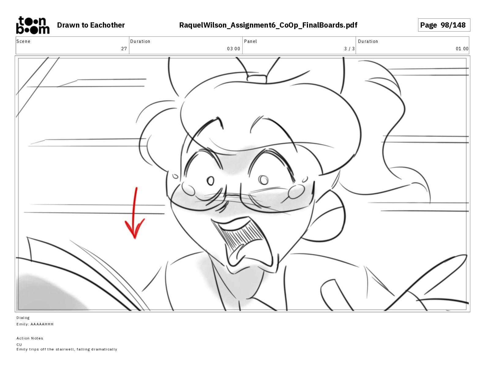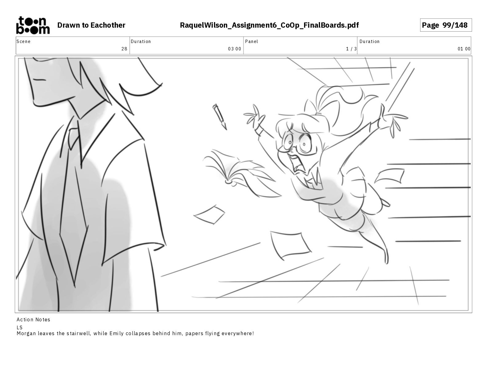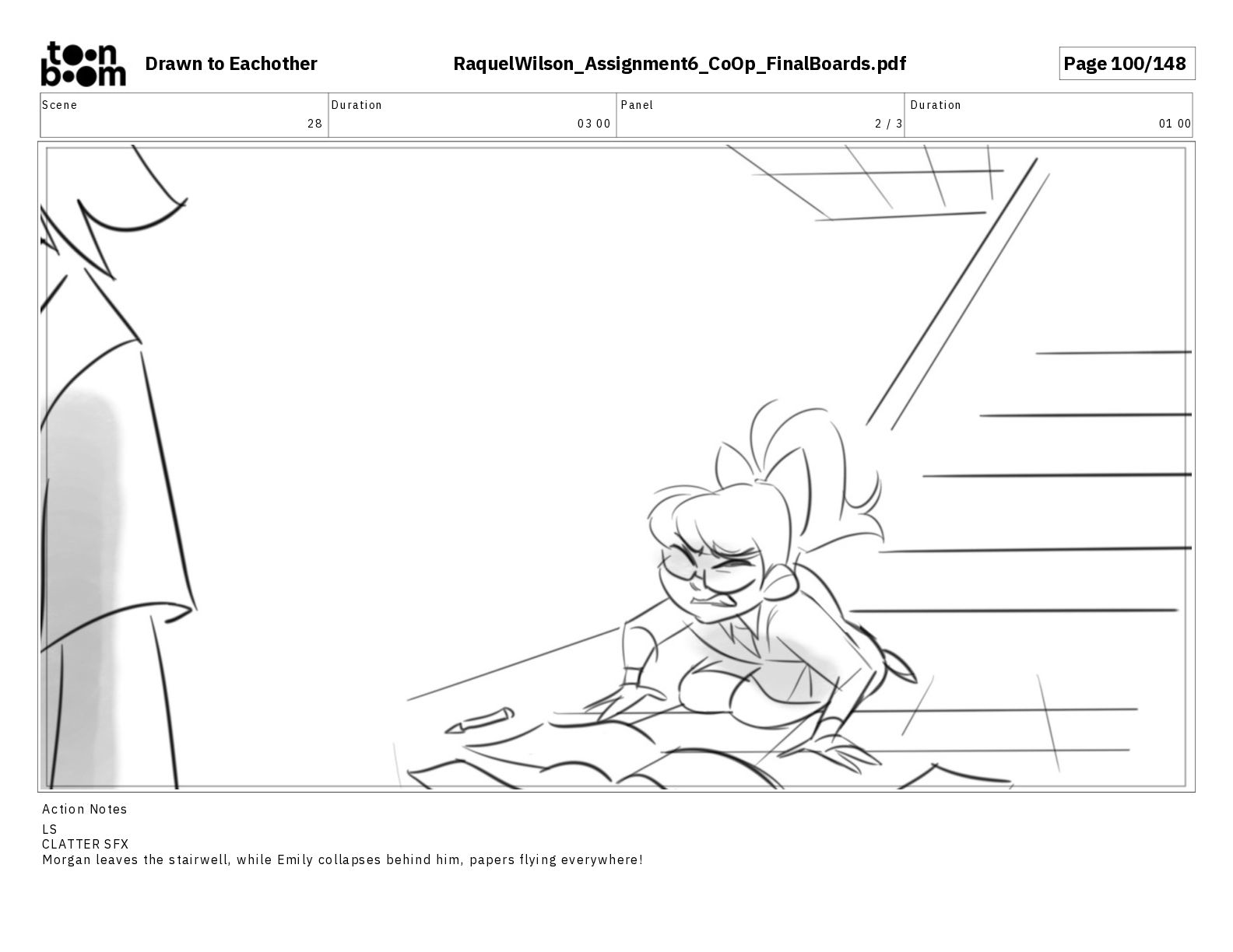01 00 Action Notes LS CLATTER SFX Morgan leaves the stairwell, while Emily collapses behind him, papers flying everywhere! Drawn to Eachother RaquelWilson_Assignment6_CoOp_FinalBoards.pdf Page 100/148