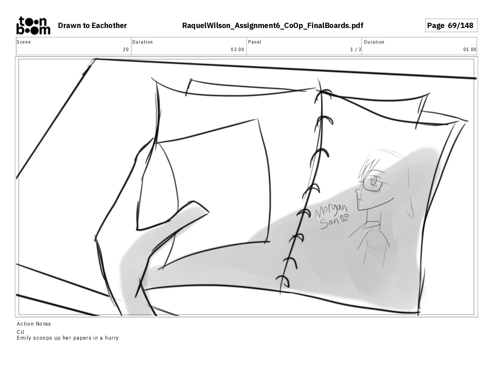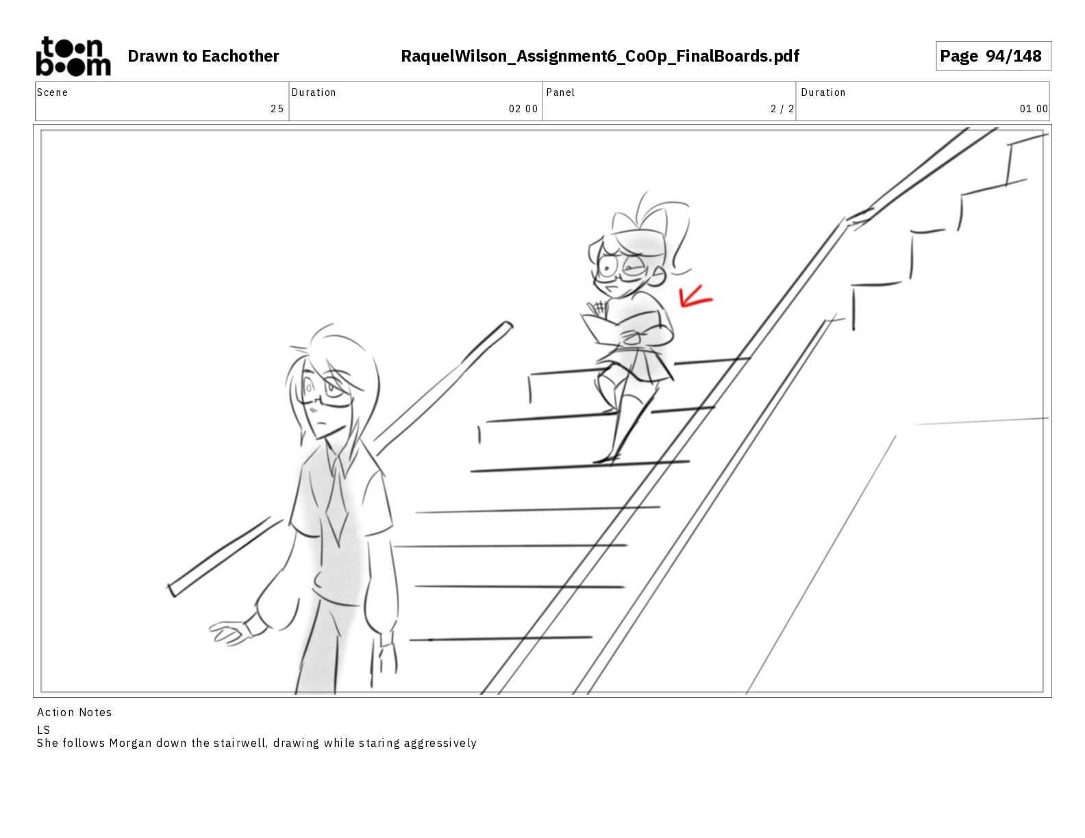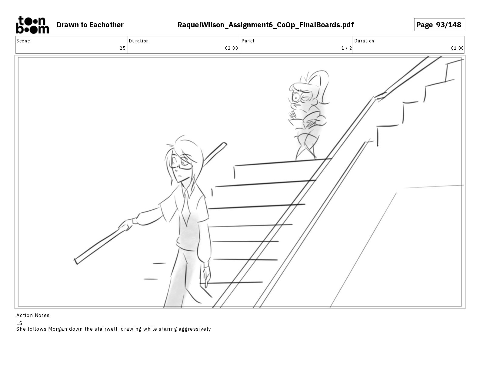 01 00 Action Notes LS CLATTER SFX Morgan leaves the stairwell, while Emily collapses behind him, papers flying everywhere! Drawn to Eachother RaquelWilson_Assignment6_CoOp_FinalBoards.pdf Page 100/148