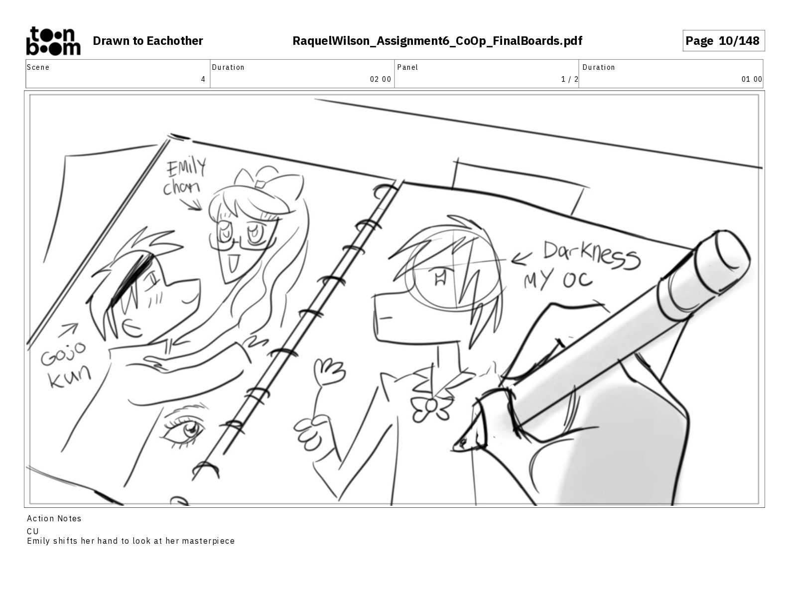 01 00 Action Notes CU Emily shifts her hand to look at her masterpiece Drawn to Eachother RaquelWilson_Assignment6_CoOp_FinalBoards.pdf Page 10/148