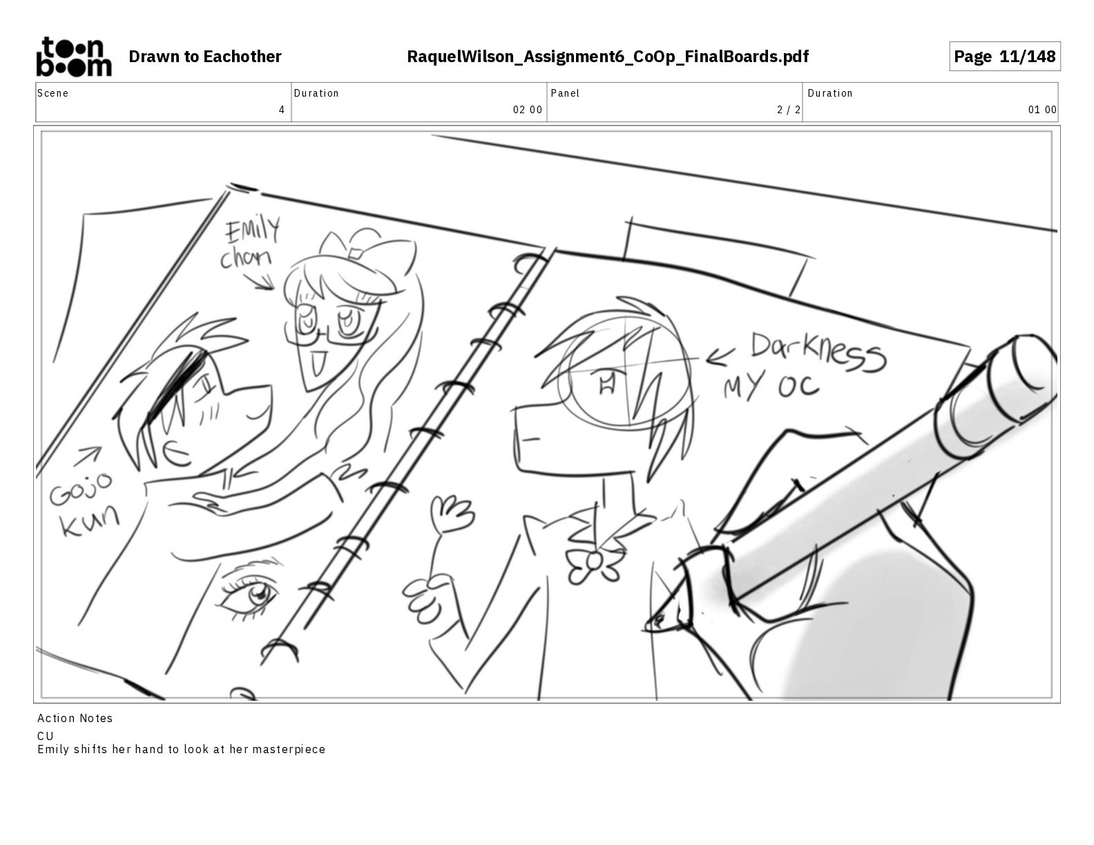 01 00 Action Notes CU Emily shifts her hand to look at her masterpiece Drawn to Eachother RaquelWilson_Assignment6_CoOp_FinalBoards.pdf Page 11/148
