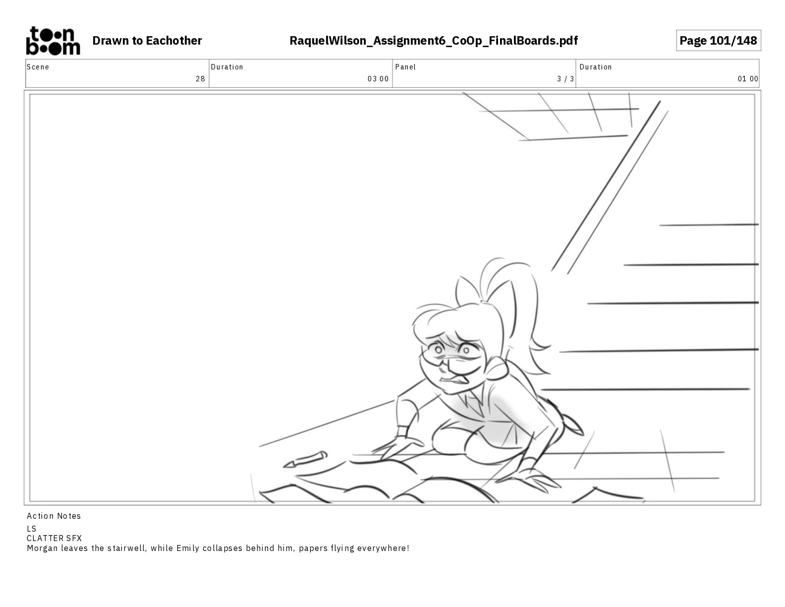 01 00 Action Notes LS CLATTER SFX Morgan leaves the stairwell, while Emily collapses behind him, papers flying everywhere! Drawn to Eachother RaquelWilson_Assignment6_CoOp_FinalBoards.pdf Page 101/148