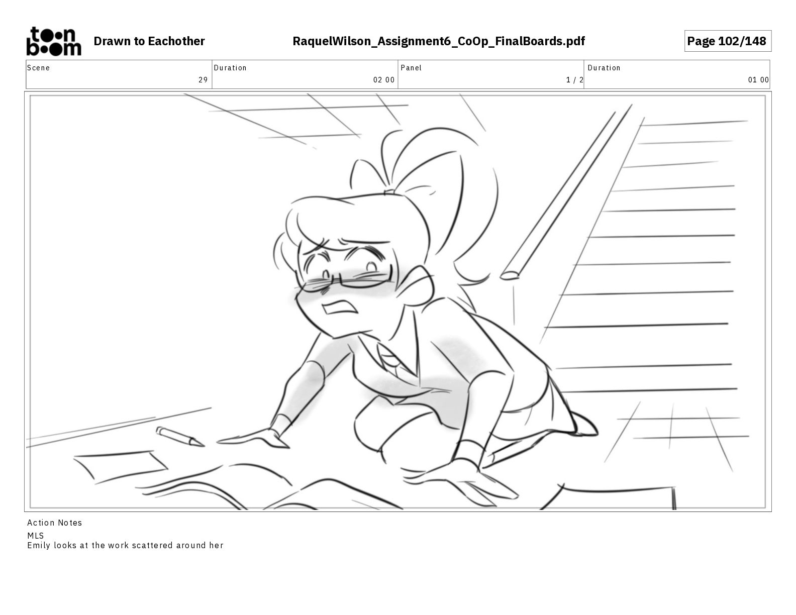 01 00 Action Notes MLS Emily looks at the work scattered around her Drawn to Eachother RaquelWilson_Assignment6_CoOp_FinalBoards.pdf Page 102/148