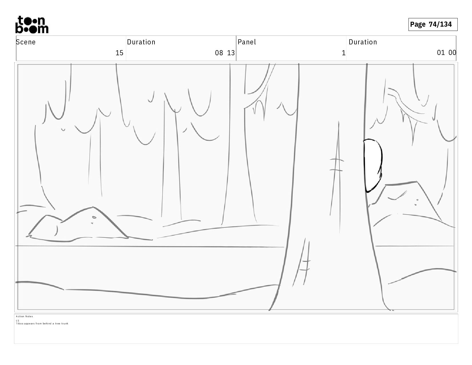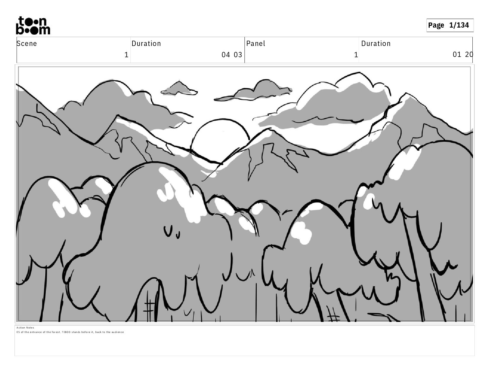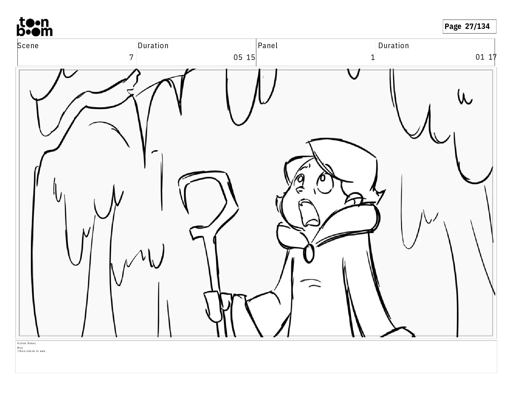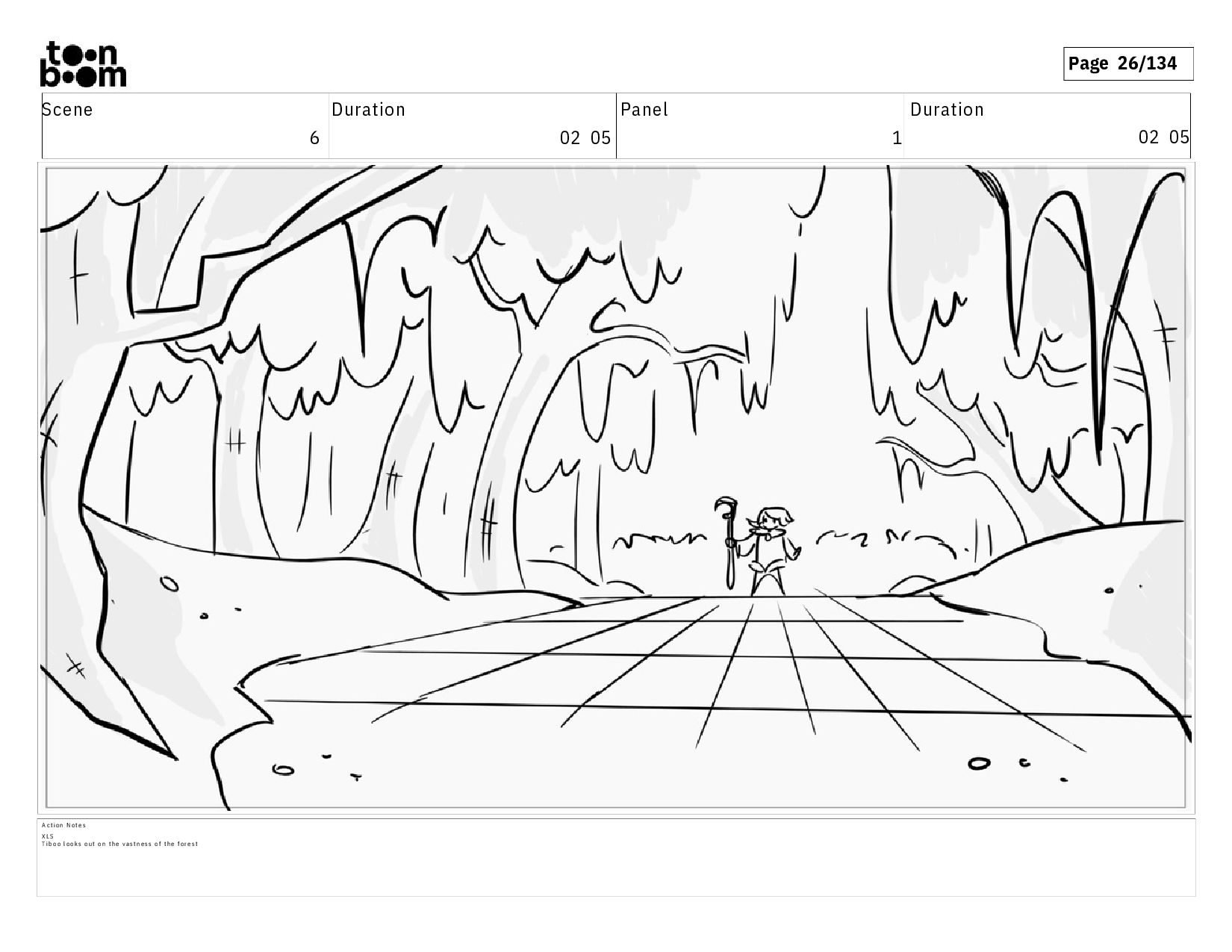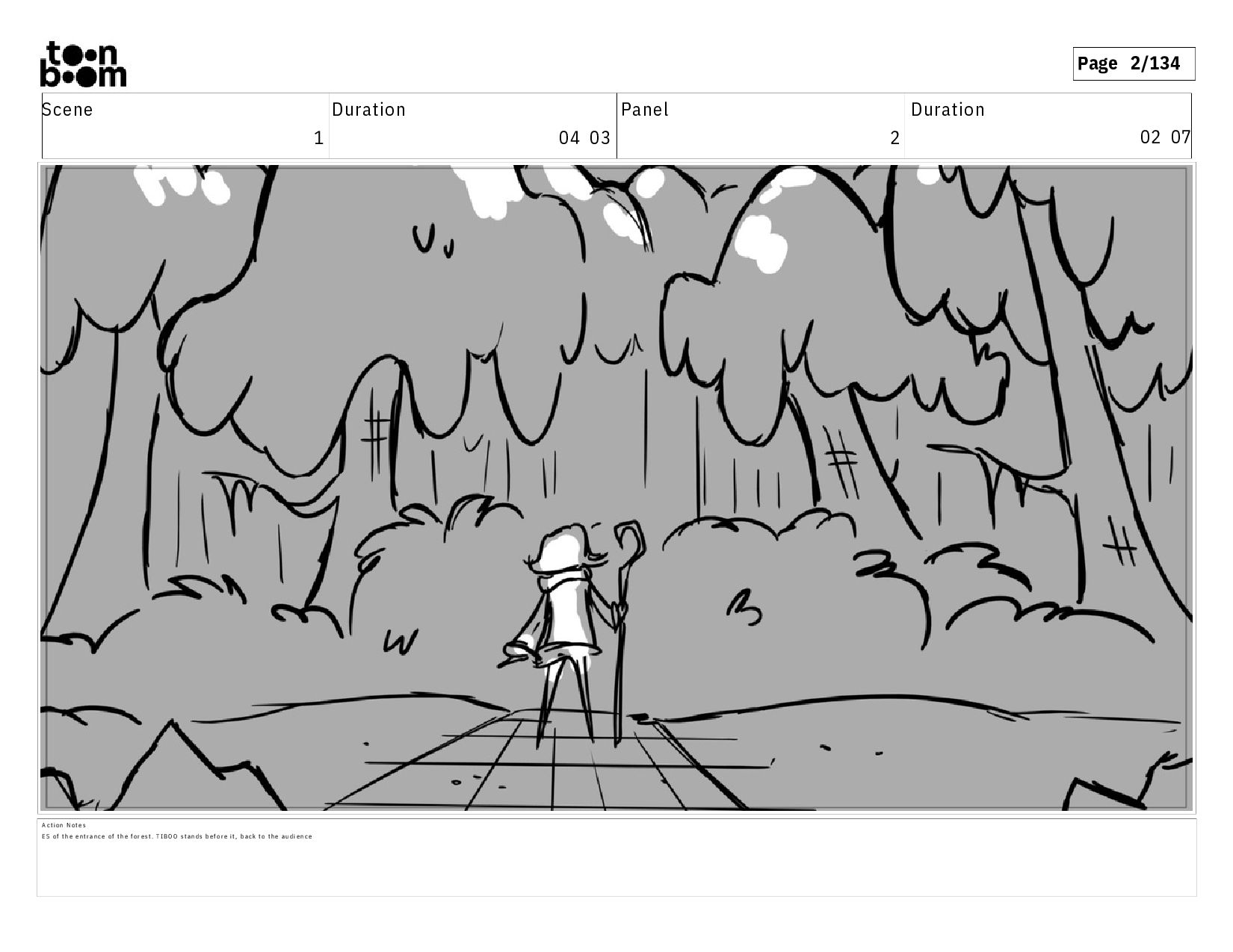 02 07 A c t i o n N o t e s E S o f t h e e n t r a n c e o f t h e f o r e s t . T I B O O s t a n d s b e f o r e i t , b a c k t o t h e a u d i e n c e