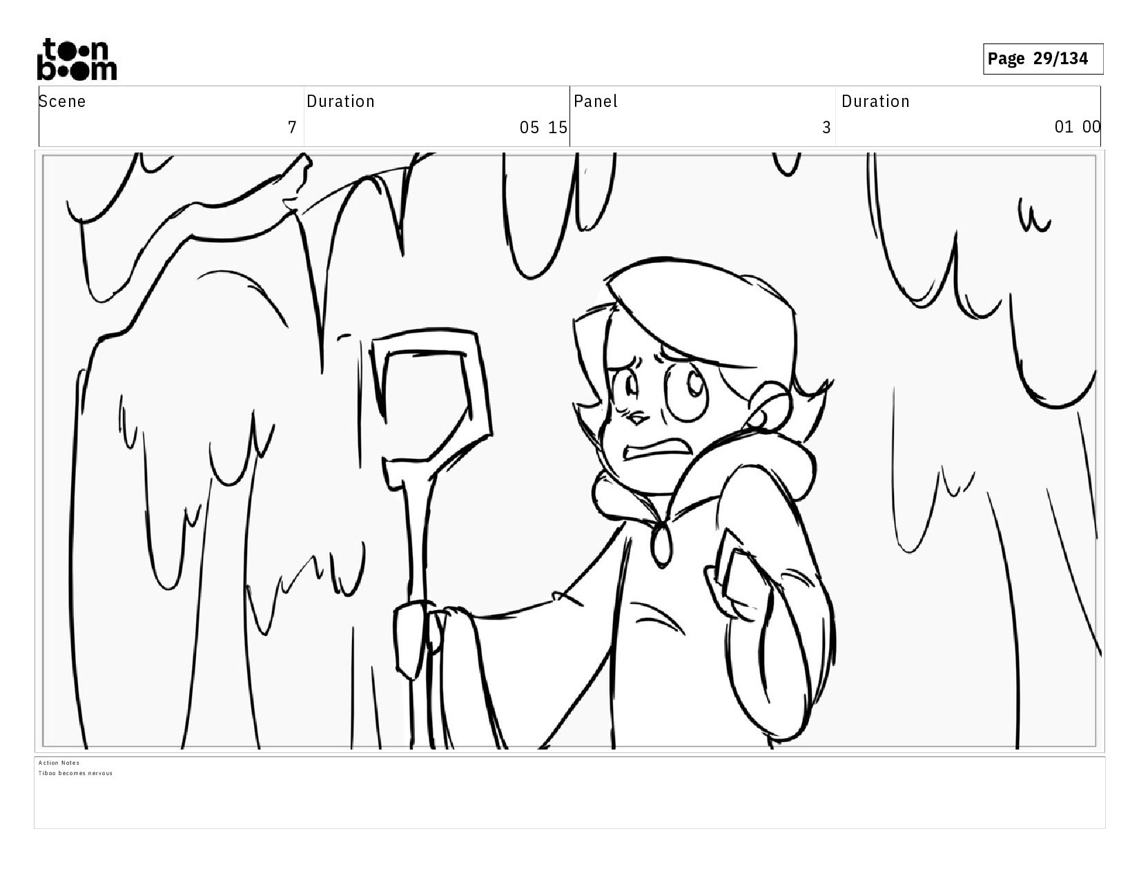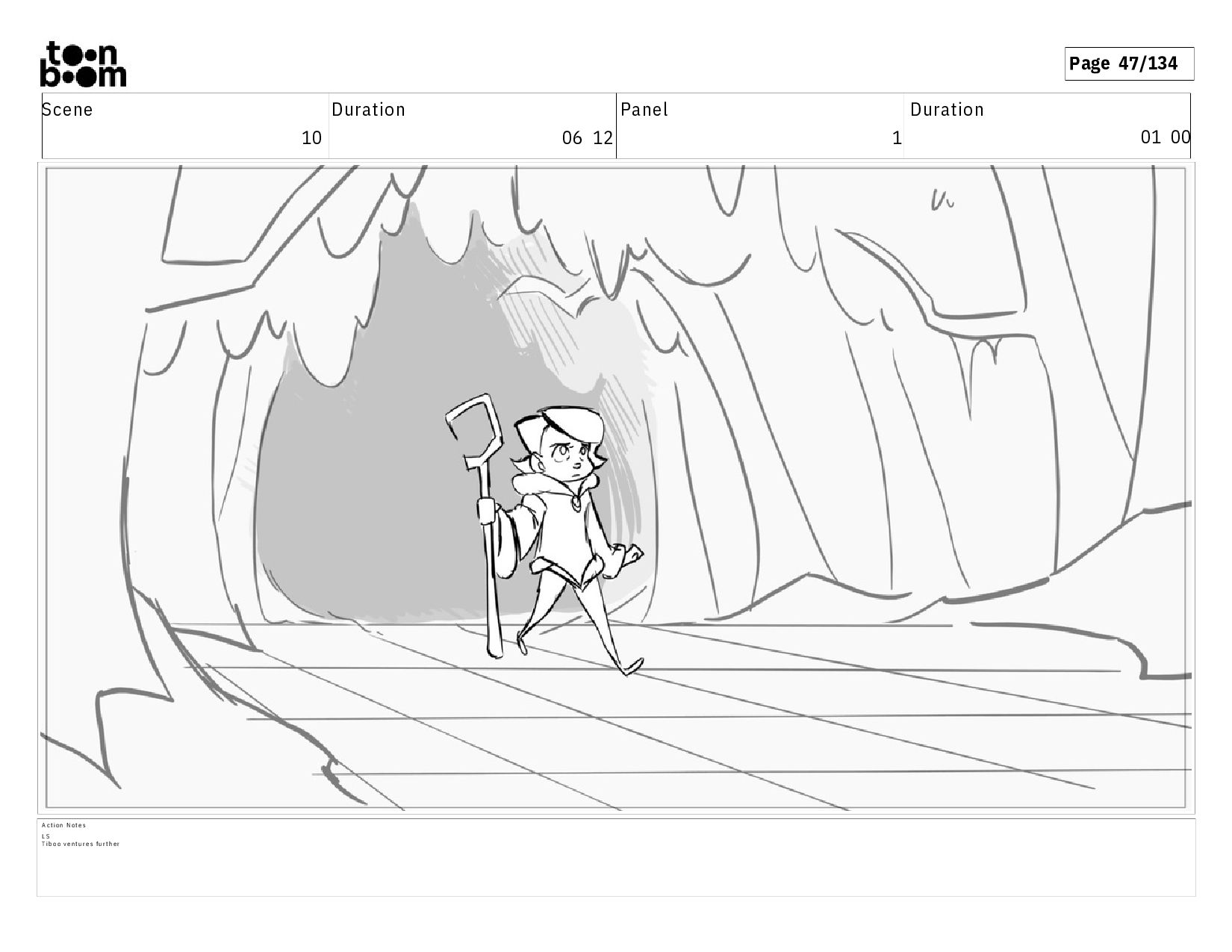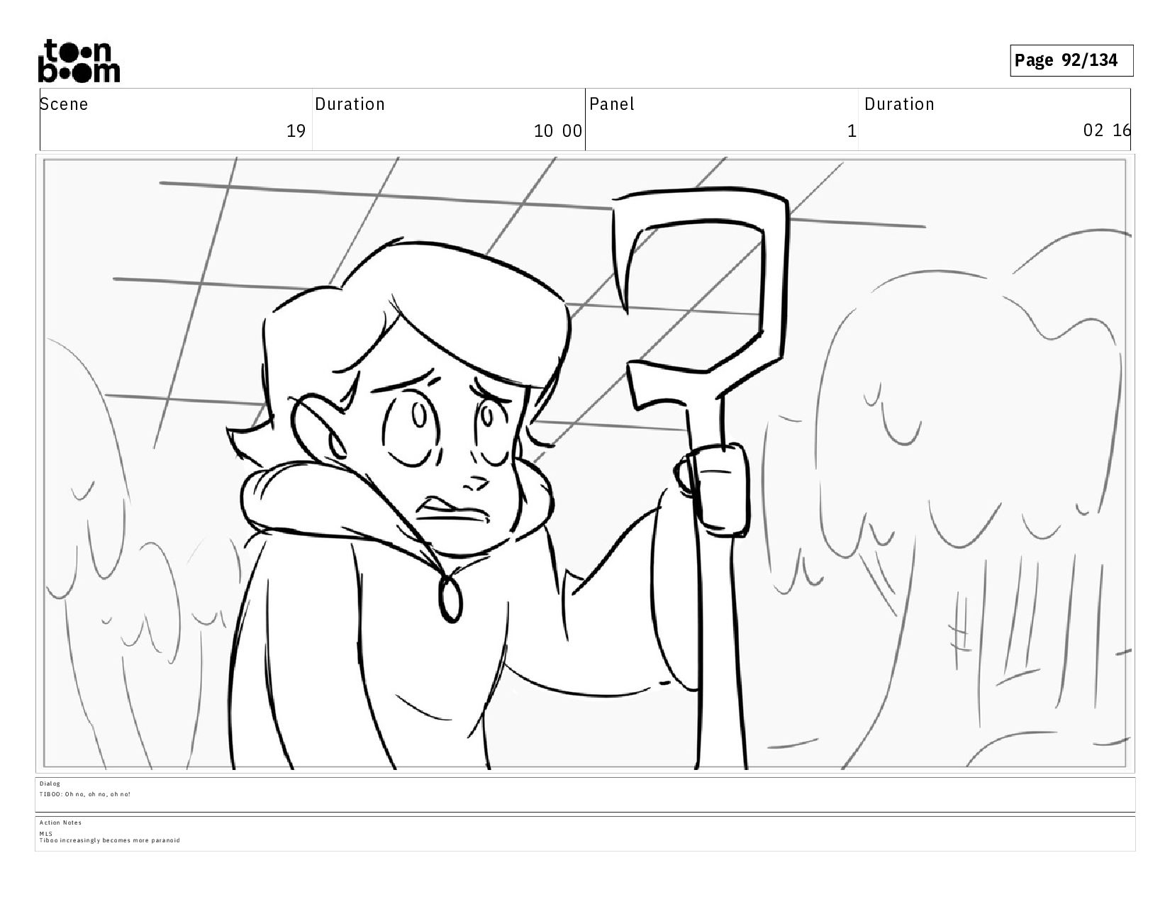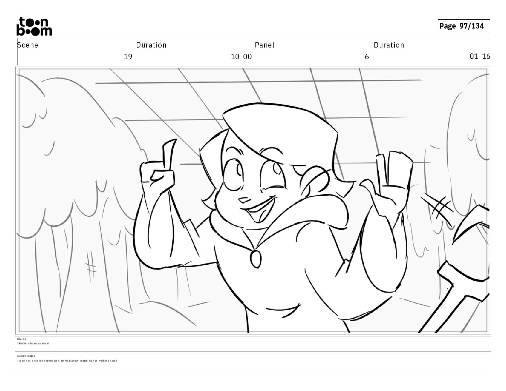 01 16 D i a l o g T I B O O : I h a v e a n i d e a ! A c t i o n N o t e s T i b o o h a s a c l e v e r e x p r e s s i o n , i m m e d i a t e l y d r o p p i n g h e r w a l k i n g s t i c k