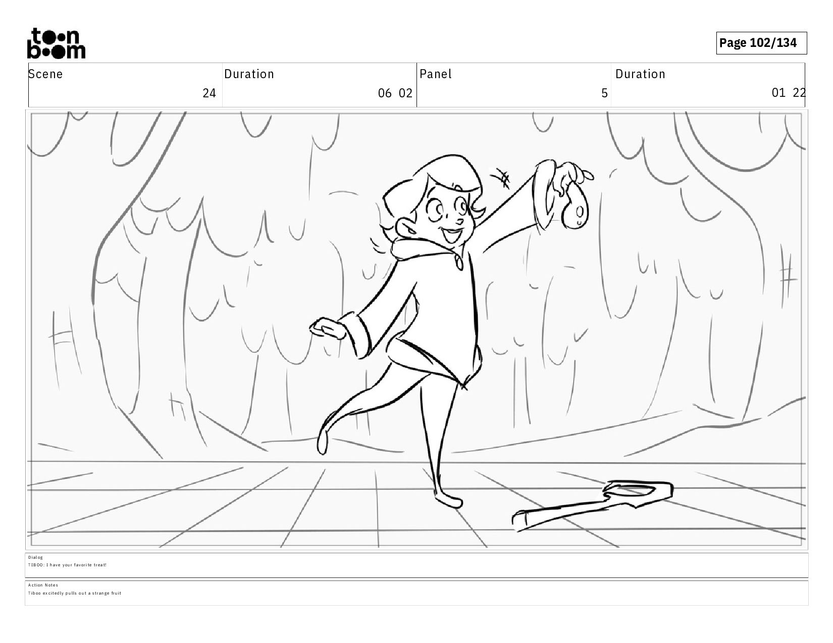 01 22 D i a l o g T I B O O : I h a v e y o u r f a v o r i t e t r e a t ! A c t i o n N o t e s T i b o o e x c i t e d l y p u l l s o u t a s t r a n g e f r u i t