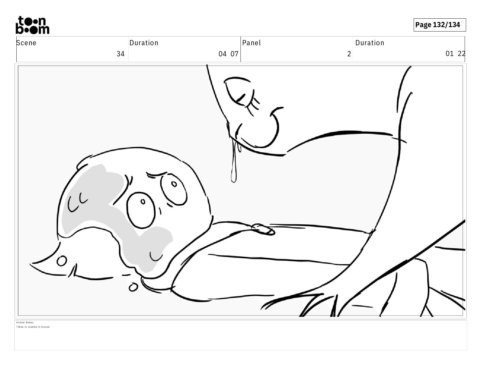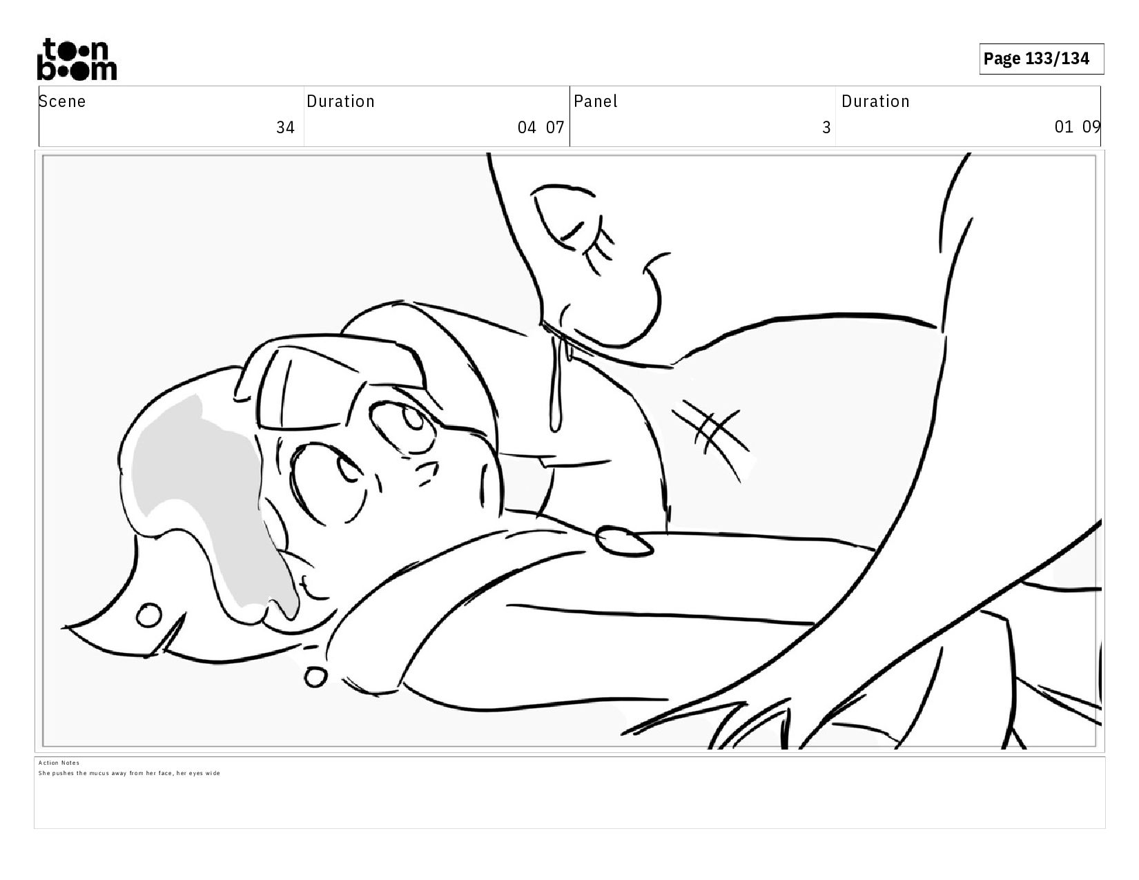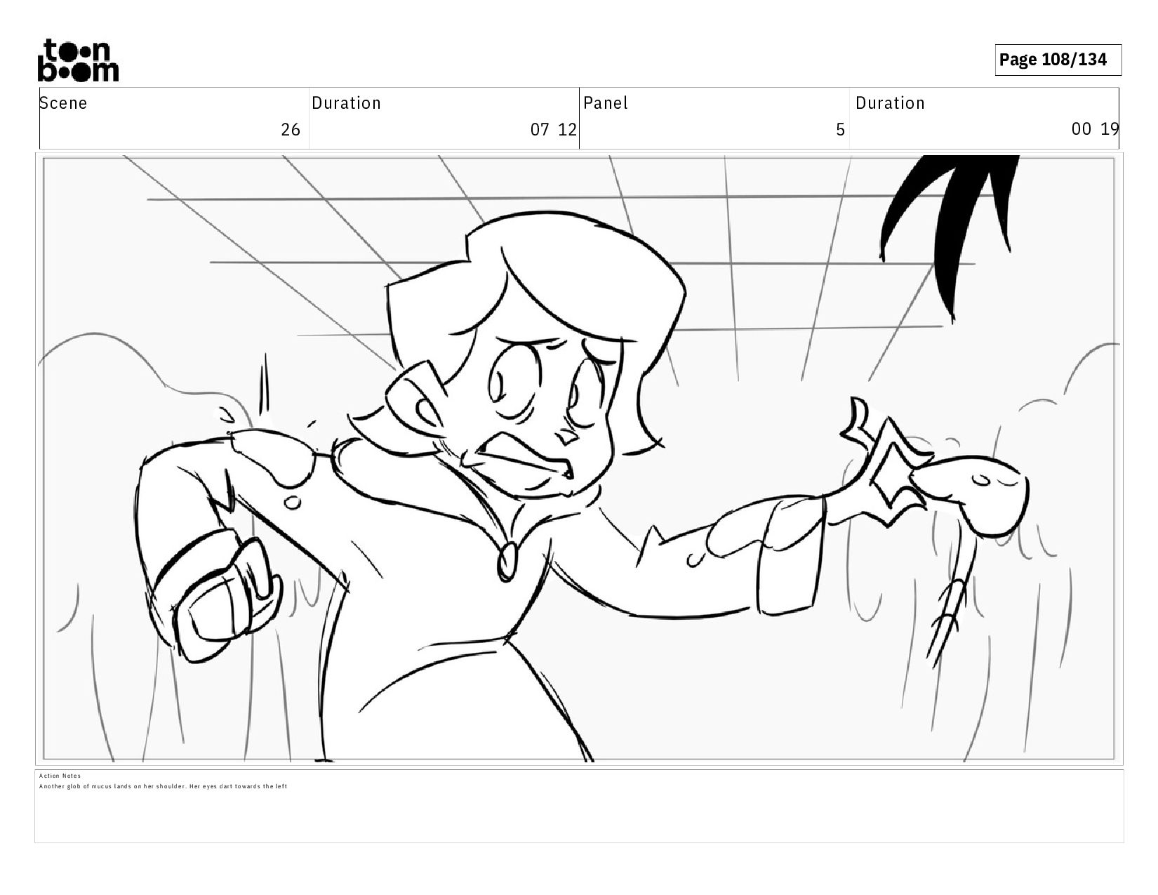00 19 A c t i o n N o t e s A n o t h e r g l o b o f m u c u s l a n d s o n h e r s h o u l d e r . H e r e y e s d a r t t o w a r d s t h e l e f t