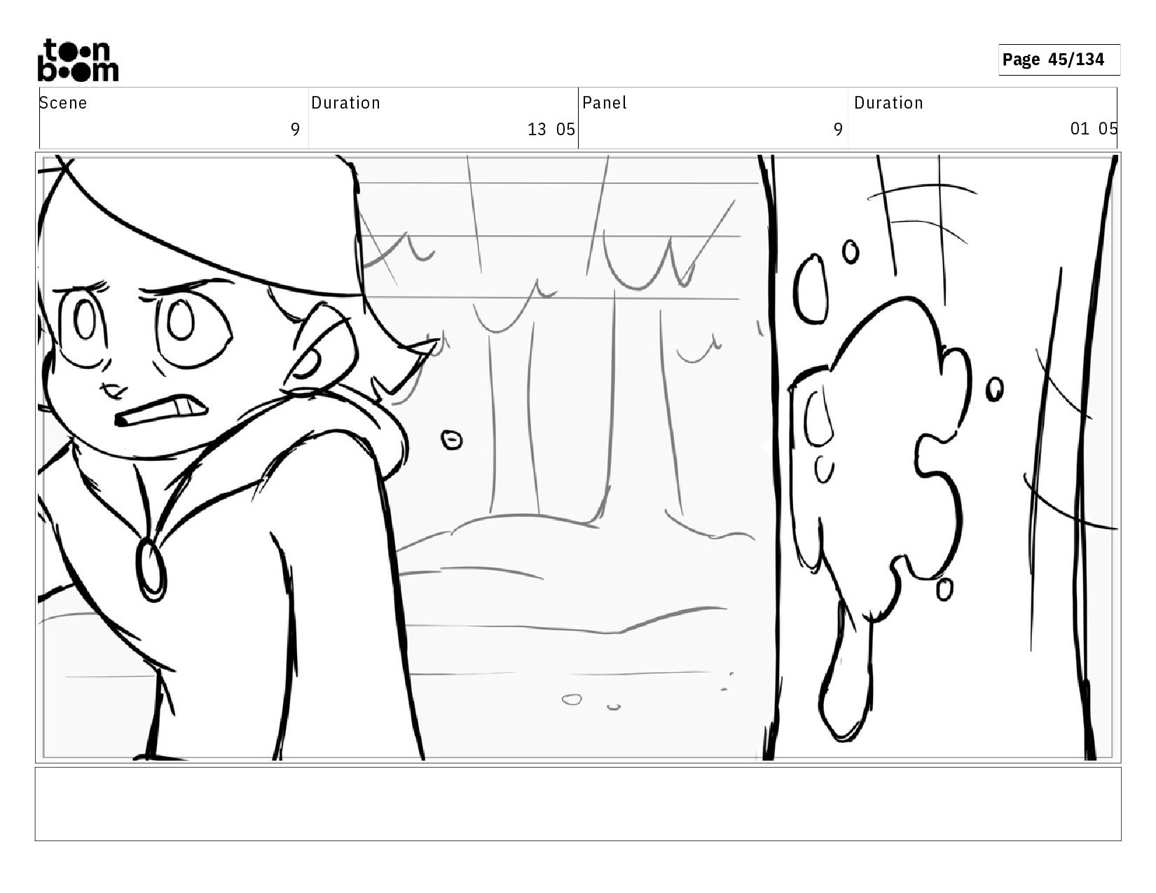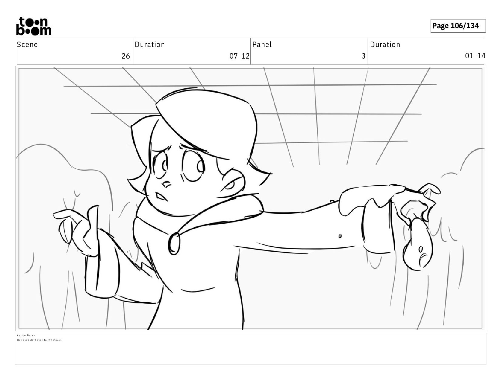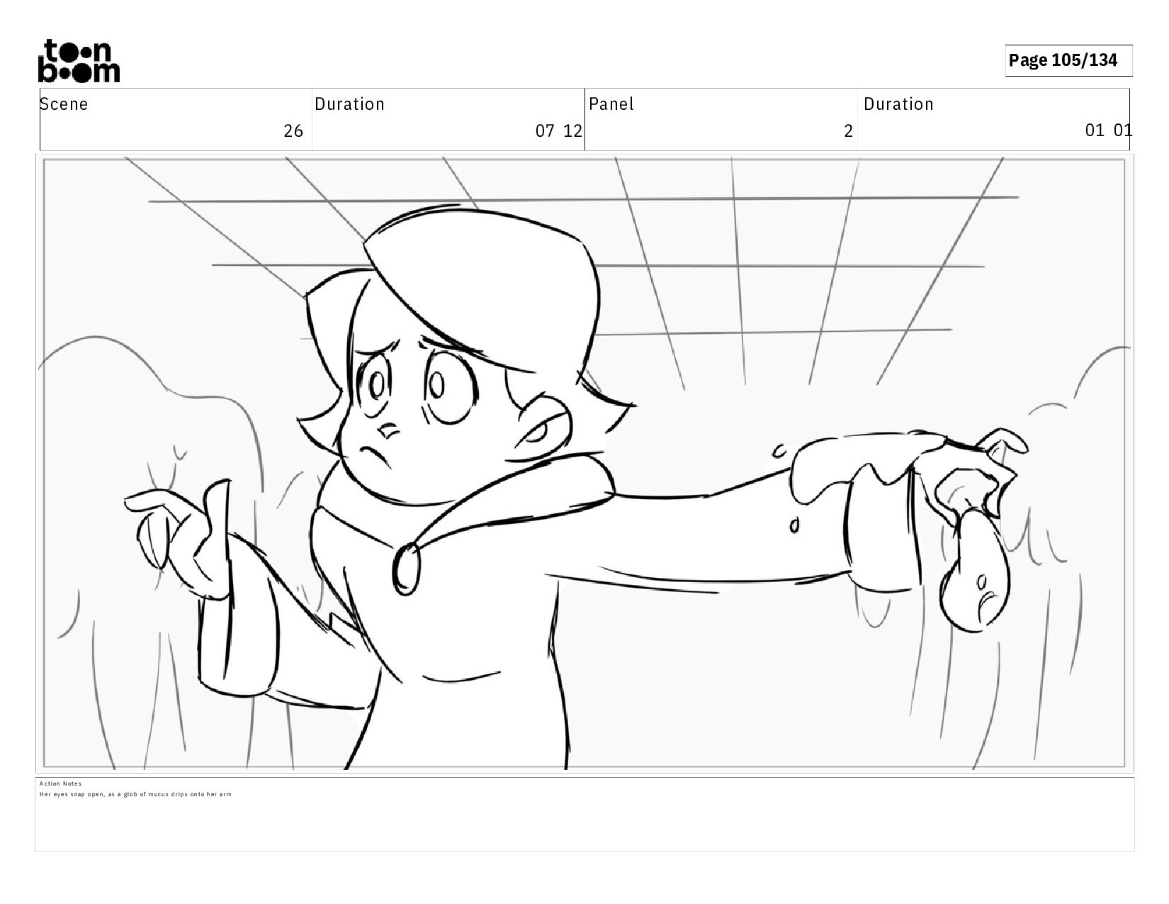 00 19 A c t i o n N o t e s A n o t h e r g l o b o f m u c u s l a n d s o n h e r s h o u l d e r . H e r e y e s d a r t t o w a r d s t h e l e f t