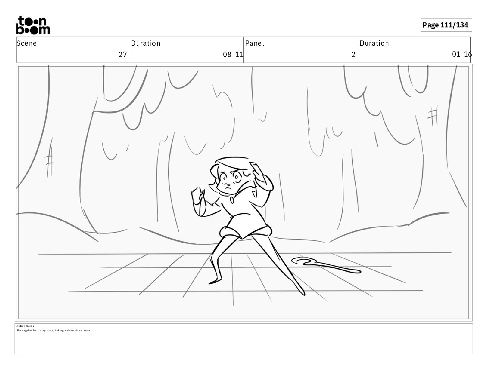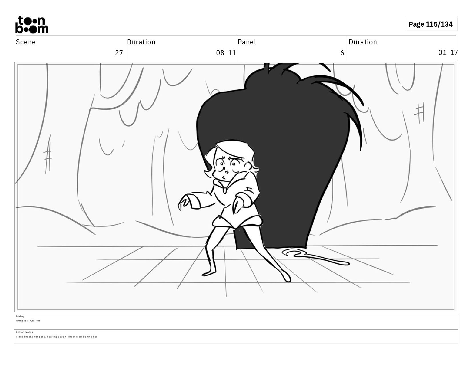01 17 D i a l o g M O N S T E R : G r r r r r r r A c t i o n N o t e s T i b o o b r e a k s h e r p o s e , h e a r i n g a g r o w l e r u p t f r o m b e h i n d h e r