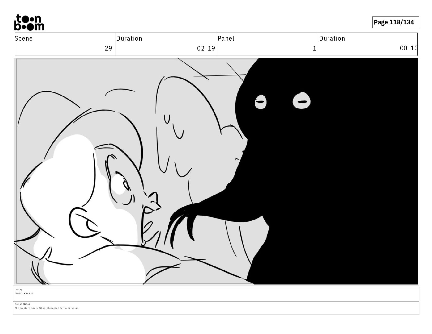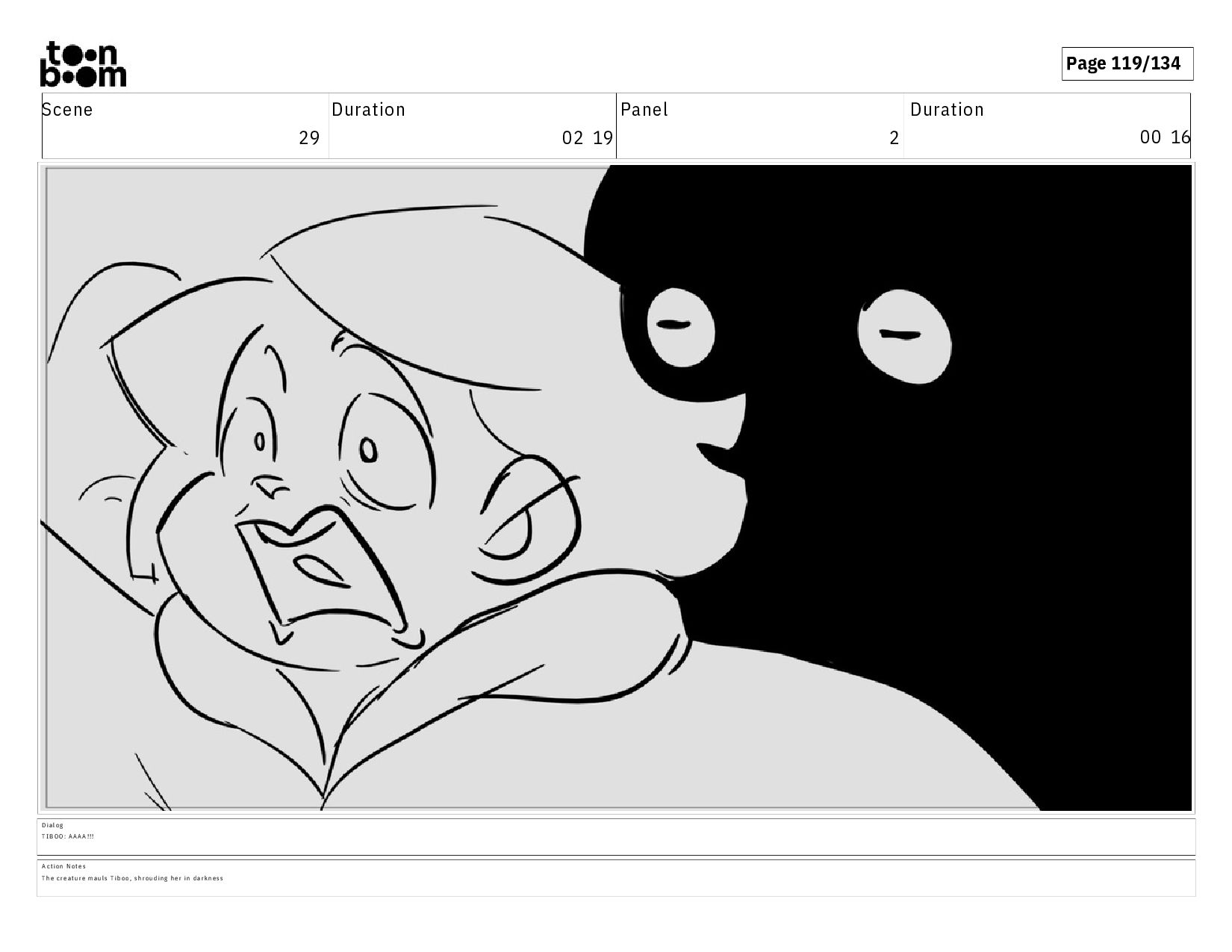 00 16 D i a l o g T I B O O : A A A A ! ! ! A c t i o n N o t e s T h e c r e a t u r e m a u l s T i b o o , s h r o u d i n g h e r i n d a r k n e s s