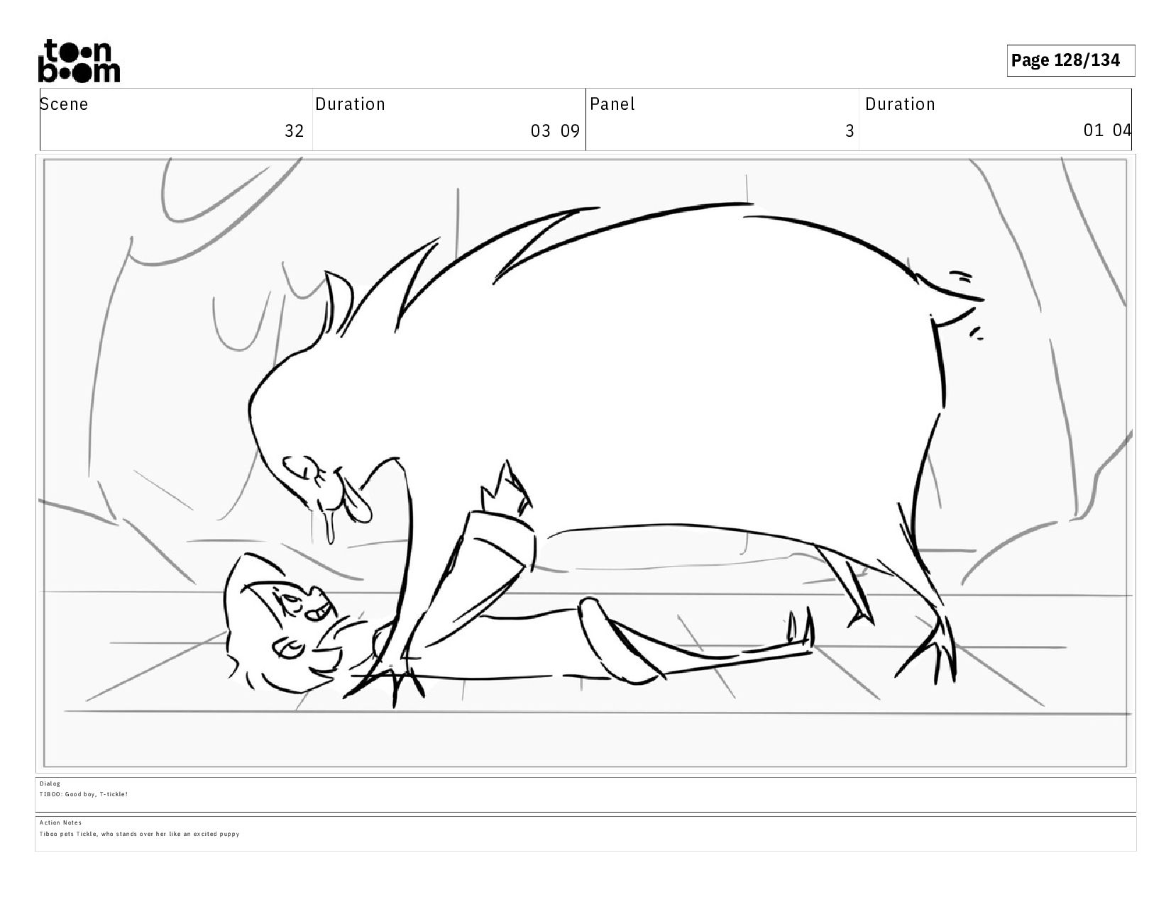 01 04 D i a l o g T I B O O : G o o d b o y , T - t i c k l e ! A c t i o n N o t e s T i b o o p e t s T i c k l e , w h o s t a n d s o v e r h e r l i k e a n e x c i t e d p u p p y