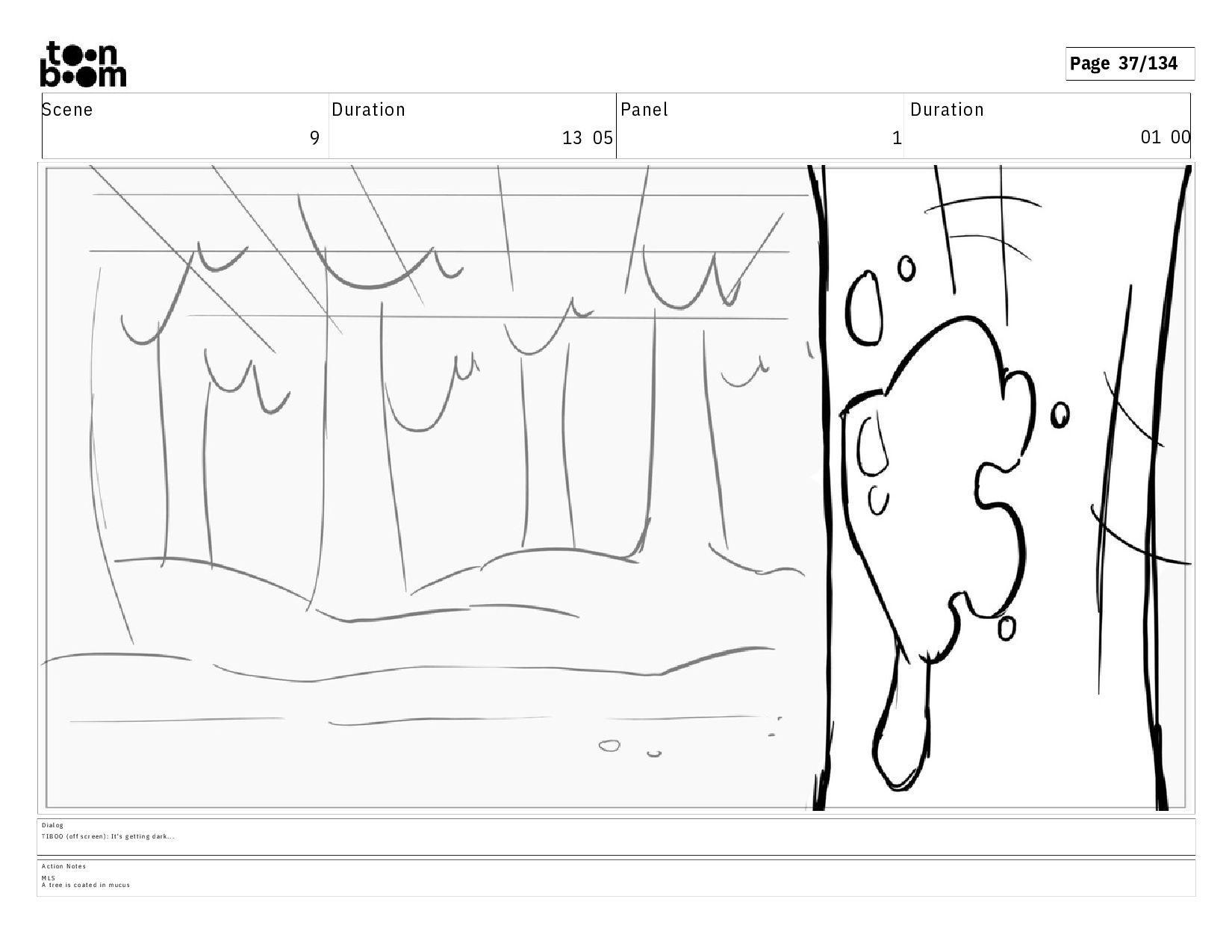 01 00 A c t i o n N o t e s M L S A t r e e i s c o a t e d i n m u c u s D i a l o g T I B O O ( o f f s c r e e n ) : I t ' s g e t t i n g d a r k . . .
