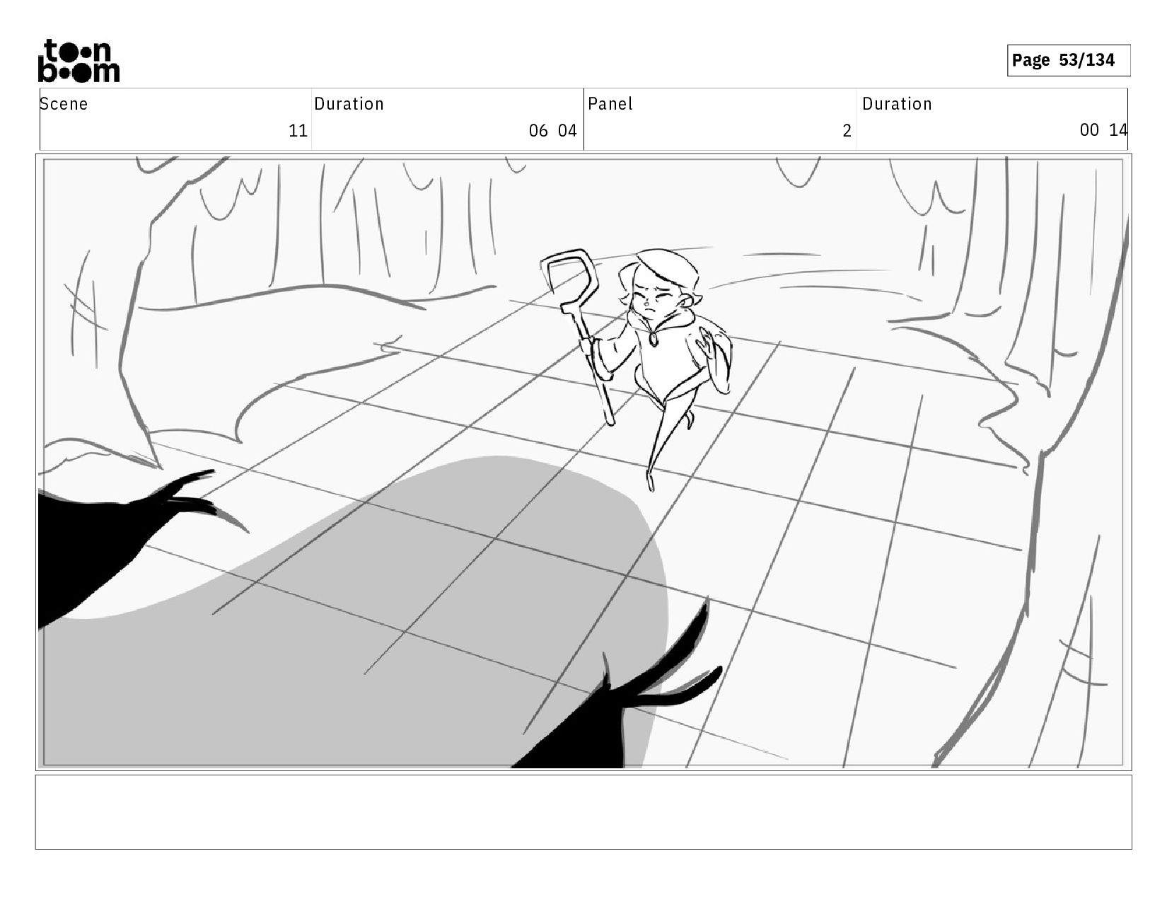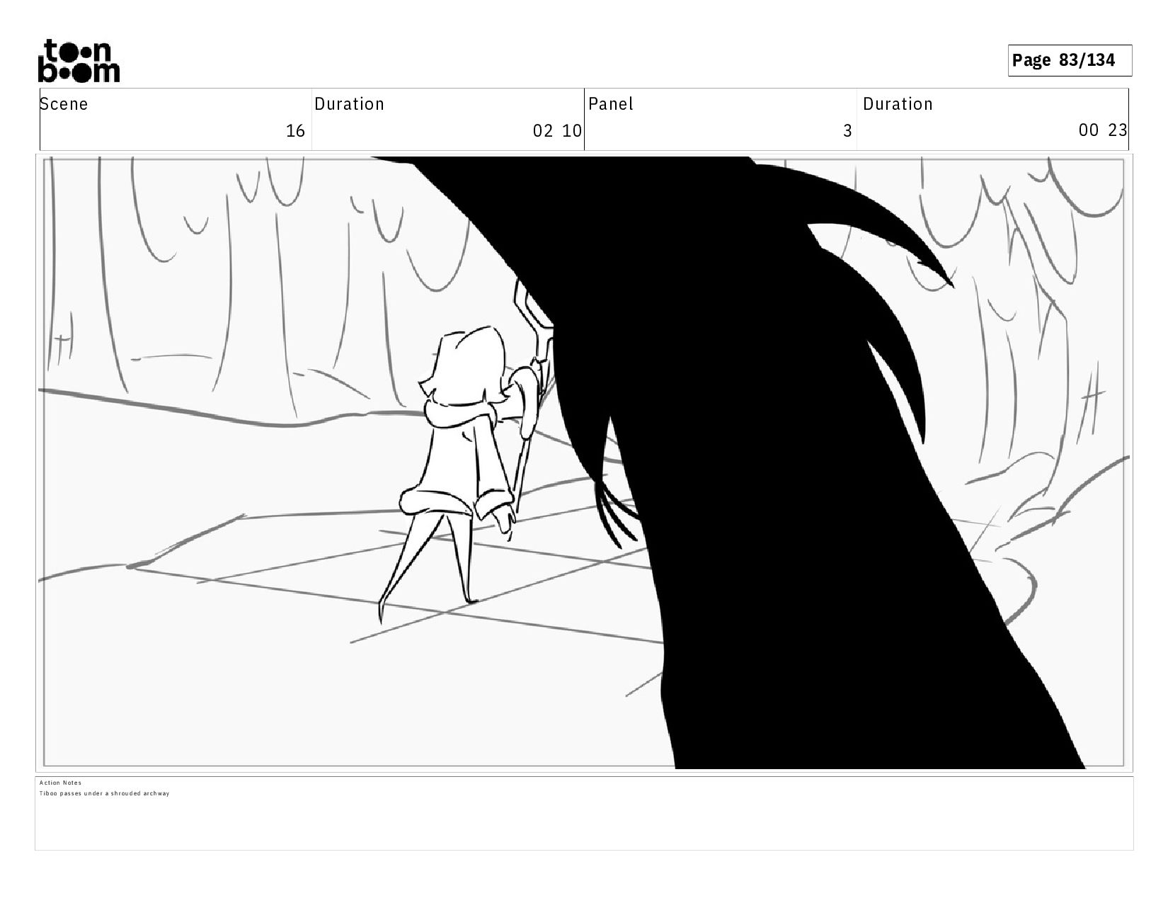 03 23 A c t i o n N o t e s T i b o o w a l k s i n t o t h e c a m e r a , h e r w a l k i n g s t i c k f r a m i n g t h e f i g u r e , w h o a p p e a r s s a d